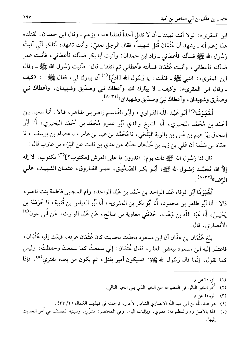 [8032] أخبرنا أبو الوفاء عبد الواحد بن حمد بن عبد الواحد وأم المجتبى فاطمة بنت ناصر قالا أنا أبو طاهر بن محمود أنا أبو بكر بن المقرئ أنا أبو العباس بن قتيبة نا حرملة بن يحيى أنا عبد الله بن وهب حدثني معاوية بن صالح عن عبد الوارث عن أبي عون (4) الأنصاري قال بلغ عثمان بن عفان أن ابن مسعود يحدث بحديث كان عثمان عرفه فبعث إليه عثمان فاعتذر إليه ابن مسعود ببعض العذر فقال عثمان إني سمعت كما سمعت وحفظت وليس كما تقول إنما قال رسول الله (صلى الله عليه وسلم) سيكون أمير يقتل ثم يكون من بعده مفتري (5) فإذا