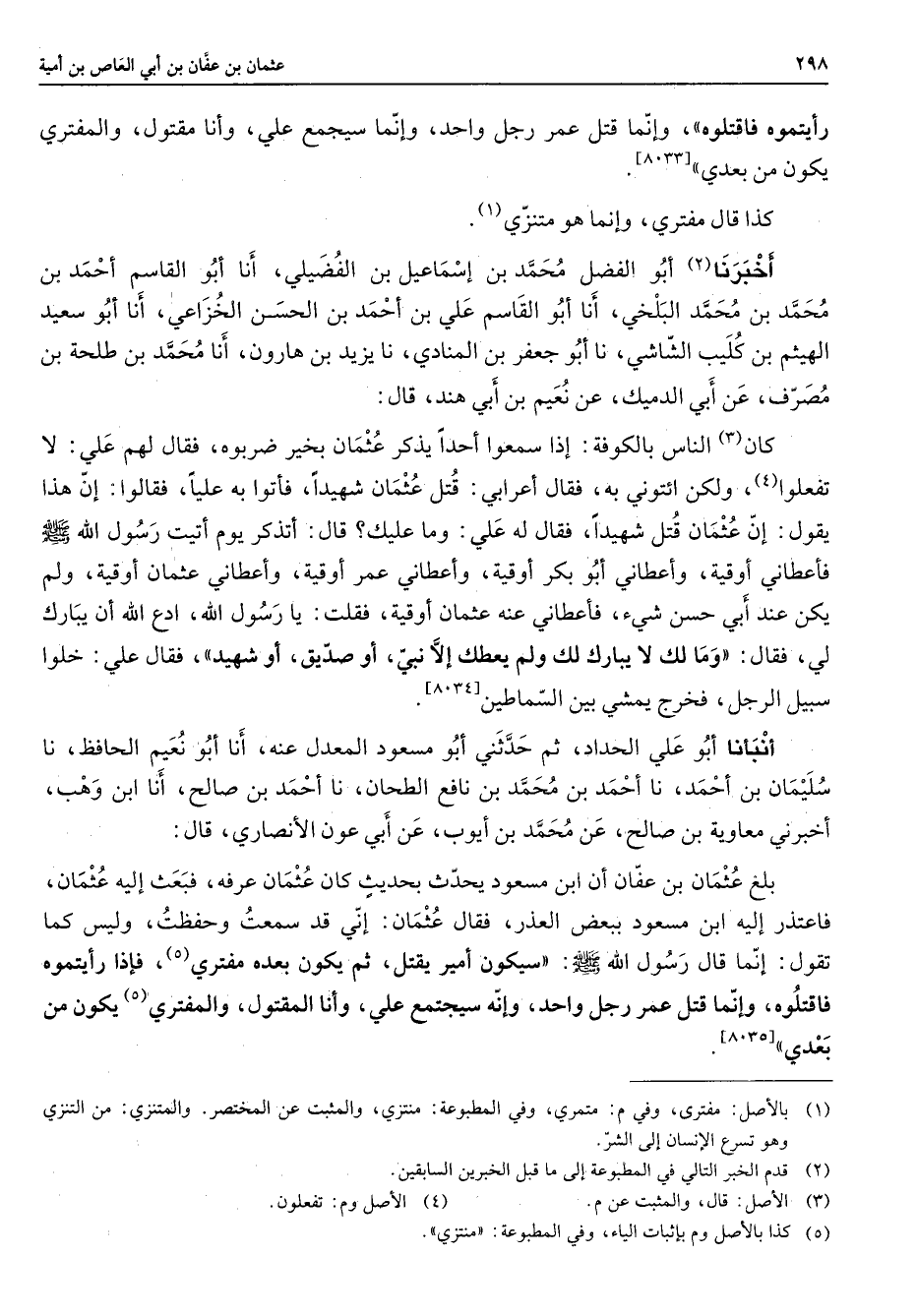 [8033] كذا قال مفتري وإنما هو متنزي (1) أخبرنا (2) أبو الفضل محمد بن إسماعيل بن الفضيلي أنا أبو القاسم أحمد بن محمد بن محمد البلخي أنا أبو القاسم علي بن أحمد بن الحسن الخزاعي أنا أبو سعيد الهيثم بن كليب الشاشي نا أبو جعفر بن المنادي نا يزيد بن هارون أنا محمد بن طلحة بن مصرف عن أبي الدميك عن نعيم بن أبي هند قال كان (3) الناس بالكوفة إذا سمعوا أحدا يذكر عثمان بخير ضربوه فقال لهم علي لا تفعلوا (4) ولكن ائتوني به فقال أعرابي قتل عثمان شهيدا فأتوا به عليا فقالوا إن هذا يقول إن عثمان قتل شهيدا فقال له علي وما عليك قال أتذكر يوم أتيت رسول الله (صلى الله عليه وسلم) فأعطاني أوقية وأعطاني أبو بكر أوقية وأعطاني عمر أوقية وأعطاني عثمان أوقية ولم يكن عند أبي حسن شئ فأعطاني عنه عثمان أوقية فقلت يا رسول الله ادع الله أن يبارك لي فقال وما لك لا يبارك لك ولم يعطك إلا نبي أو صديق أو شهيد فقال علي خلوا سبيل الرجل فخرج يمشي بين السماطين