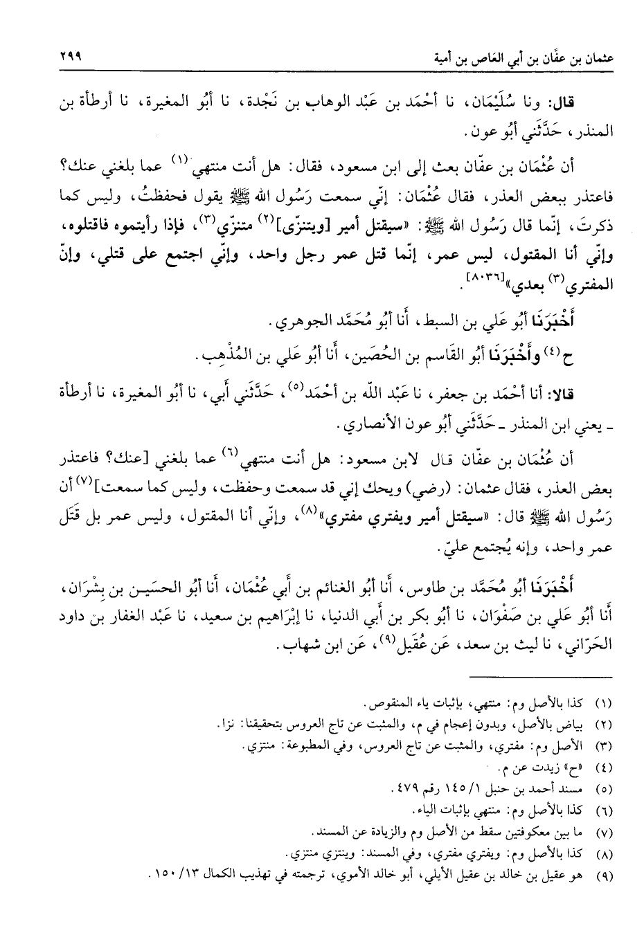 [8036] أخبرنا أبو علي بن السبط أنا أبو محمد الجوهري ح (4) وأخبرنا أبو القاسم بن الحصين أنا أبو علي بن المذهب قالا أنا أحمد بن جعفر نا عبد الله بن أحمد (5) حدثني أبي نا أبو المغيرة نا أرطأة يعني ابن المنذر حدثني أبو عون الأنصاري أن عثمان بن عفان قال لابن مسعود هل أنت منتهي (6) عما بلغني عنك فاعتذر بعض العذر فقال عثمان رضي ويحك إني قد سمعت وحفظت وليس كما سمعت (7) أن رسول الله (صلى الله عليه وسلم) قال سيقتل أمير ويفتري مفتري (8) وإني أنا المقتول وليس عمر بل قتل عمر واحد وإنه يجتمع علي أخبرنا أبو محمد بن طاوس أنا أبو الغنائم بن أبي عثمان أنا أبو الحسين بن بشران أنا أبو علي بن صفوان نا أبو بكر بن أبي الدنيا نا إبراهيم بن سعيد نا عبد الغفار بن داود الحراني نا ليث بن سعد عن عقيل (9) عن ابن شهاب