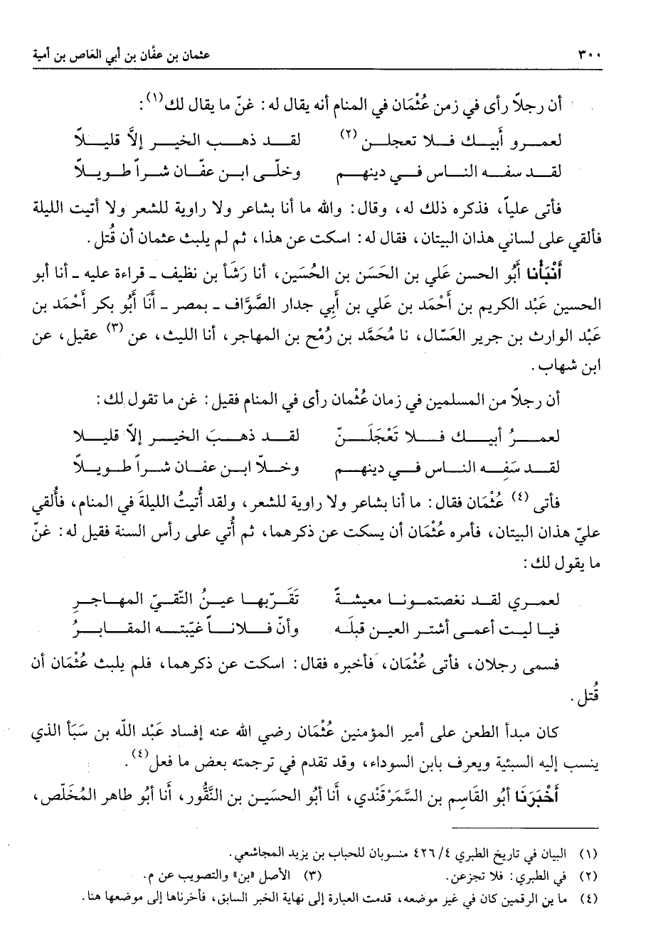 أن رجلا رأى في زمن عثمان في المنام أنه يقال له غن ما يقال لك (1) لعمرو أبيك فلا تعجلن (2) * لقد ذهب الخير إلا قليلا لقد سفه الناس في دينهم * وخلى ابن عفان شرا طويلا * فأتى عليا فذكره ذلك له وقال والله ما أنا بشاعر ولا راوية للشعر ولا أتيت الليلة فألقي على لساني هذان البيتان فقال له اسكت عن هذا ثم لم يلبث عثمان أن قتل أنبأنا أبو الحسن علي بن الحسين أنا رشأ بن نظيف قراءة عليه أنا أبو الحسين عبد الكريم بن أحمد بن علي بن أبي جدار الصواف بمصر أنا أبو بكر أحمد بن عبد الوارث بن جرير العسال نا محمد بن رمح بن المهاجر أنا الليث عن (3) عقيل عن ابن شهاب أن رجلا من المسلمين في زمان عثمان رأى في المنام فقيل غن ما تقول لك لعمر أبيك فلا تعجلن * لقد ذهب الخير إلا قليلا لقد سفه الناس في دينهم * وخلا ابن عفان شرا طويلا * فأتى (4) عثمان فقال ما أنا بشاعر ولا راوية للشعر ولقد أتيت الليلة في المنام فألقي علي هذان البيتان فأمره عثمان أن يسكت عن ذكرهما ثم أتي على رأس السنة فقيل له غن ما يقول لك لعمري لقد نغصتمونا معيشة * تقربها عين التقي المهاجر فيا ليت أعمى أشتر العين قبله * وأن فلانا غيبته المقابر * فسمى رجلان فأتى عثمان فأخبره فقال اسكت عن ذكرهما فلم يلبث عثمان أن قتل كان مبدأ الطعن على أمير المؤمنين عثمان Bهـ إفساد عبد الله بن سبأ الذي ينسب إليه السبئية ويعرف بابن السوداء وقد تقدم في ترجمته بعض ما فعل (4) أخبرنا أبو القاسم بن السمرقندي أنا أبو الحسين بن النقور أنا أبو طاهر المخلص
