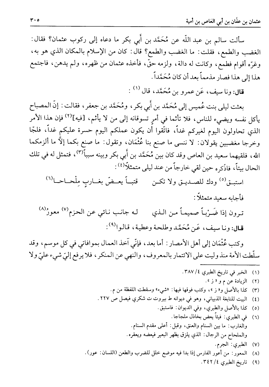 سألت سالم بن عبد الله عن محمد بن أبي بكر ما دعاه إلى ركوب عثمان فقال الغضب والطمع فقلت ما الغضب والطمع قال كان من الإسلام بالمكان الذي هو به وغره أقوام فطمع وكانت له دالة ولزمه حق فأخذه عثمان من ظهره ولم يدهن فاجتمع هذا إلى هذا فصار مذمما بعد أن كان محمدا قال ونا سيف عن عمرو بن محمد قال (1) بعثت ليلى بنت عميس إلى محمد بن أبي بكر ومحمد بن جعفر فقالت إن المصباح يأكل نفسه ويضئ للناس فلا تأثما في أمر تسوقانه إلى من لا يأثم [فيه] (2) فإن هذا الأمر الذي تحاولون اليوم لغيركم غدا فاتقوا أن يكون عملكم اليوم حسرة عليكم غدا فلجا وخرجا مغضبين يقولان لا ننسى ما صنع بنا عثمان وتقول ما صنع بكما إلا ما ألزمكما الله فلقيهما سعيد بن العاص وقد كان بين محمد بن أبي بكر وبينه سببا (3) فتمثل له في تلك الحال بيتا فاذكره حين لقي خارجا من عند ليلى متمثلا (4) استبق (5) ودك للصديق ولا تكن * قتبا يعض بغارب ملحاحا (6) * فأجابه سعيد متمثلا ترون إذا ضربا صميما من الذي * له جانب نائي عن الحزم (7) معور (8) * قال ونا سيف عن محمد وطلحة وعطية قالوا (9) وكتب عثمان إلى أهل الأمصار أما بعد فإني آخذ العمال بموافاتي في كل موسم وقد سلطت الأمة منذ وليت على الائتمار بالمعروف والنهي عن المنكر فلا يرفع إلي شئ علي ولا