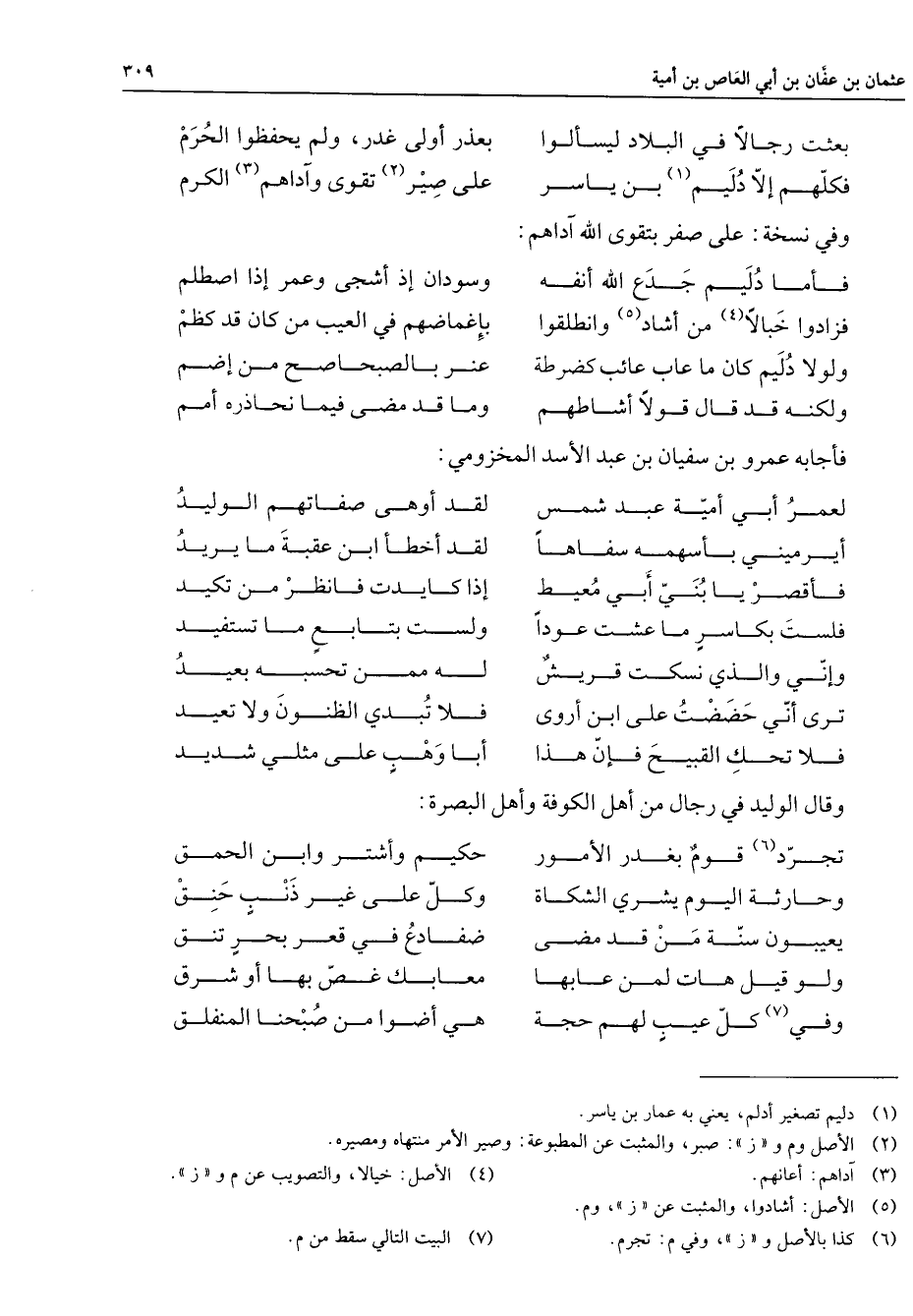 بعثت رجالا في البلاد ليسألوا * بعذر أولى غدر ولم يحفظوا الحرم فكلهم إلا دليم (1) بن ياسر * على صير (2) تقوى وآداهم (3) الكرم * وفي نسخة على صفر بتقوى الله آداهم فأما دليم جدع الله أنفه * وسودان إذ أشجى وعمر إذا اصطلم فزادوا خبالا (4) من أشاد (5) وانطلقوا * بإغماضهم في العيب من كان قد كظم ولولا دليم كان ما عاب عائب كضرطة * عنر بالصبحاصح من إضم ولكنه قد قال قولا أشاطهم * وما قد مضى فيما نحاذره أمم * فأجابه عمرو بن سفيان بن عبد الأسد المخزومي لعمر أبي أمية عبد شمس * لقد أوهى صفاتهم الوليد أيرميني بأسهمه سفاها * لقد أخطأ ابن عقبة ما يريد فأقصر يا بني أبي معيط * إذا كايدت فانظر من تكيد فلست بكاسر ما عشت عودا * ولست بتابع ما تستفيد وإني والذي نسكت قريش * له ممن تحسبه بعيد ترى أني حضضت على ابن أروى * فلا تبدي الظنون ولا تعيد فلا تحك القبيح فإن هذا * أبا وهب على مثلي شديد * وقال الوليد في رجال من أهل الكوفة وأهل البصرة تجرد (6) قوم بغدر الأمور * حكيم وأشتر وابن الحمق وحارثة اليوم يشري الشكاة * وكل على غير ذنب حنق يعيبون سنة من قد مضى * ضفادع في قعر بحر تنق ولو قيل هات لمن عابها * معابك غص بها أو شرق وفي (7) كل عيب لهم حجة * هي أضوا من صبحنا المنفلق *