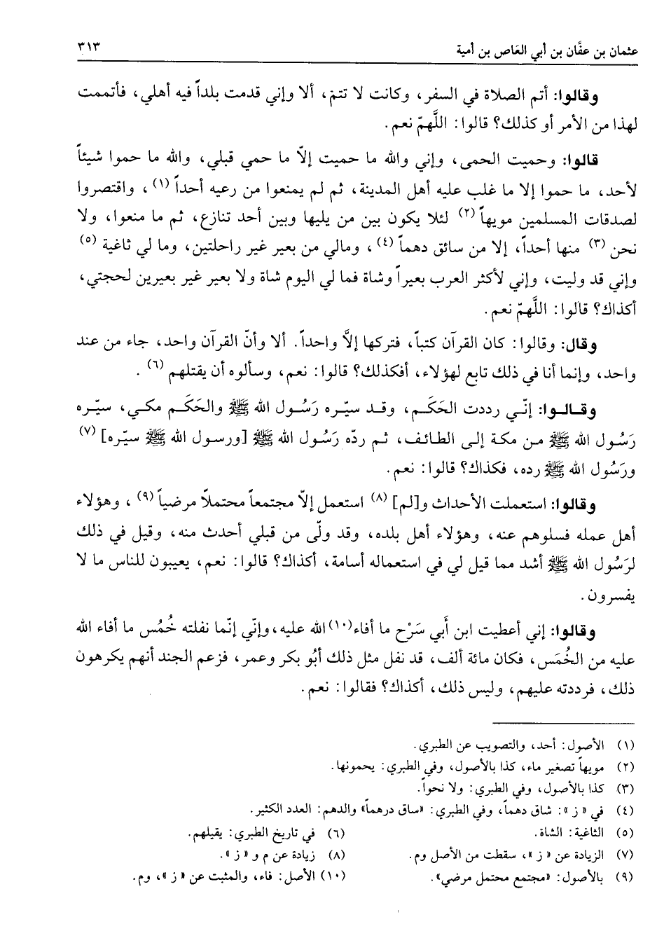 وقالوا أتم الصلاة في السفر وكانت لا تتم ألا وإني قدمت بلدا فيه أهلي فأتممت لهذا من الأمر أو كذلك قالوا اللهم نعم قالوا وحميت الحمى وإني والله ما حميت إلا ما حمي قبلي والله ما حموا شيئا لأحد ما حموا إلا ما غلب عليه أهل المدينة ثم لم يمنعوا من رعيه أحدا (1) واقتصروا لصدقات المسلمين مويها (2) لئلا يكون بين من يليها وبين أحد تنازع ثم ما منعوا ولا نحن منها أحدا إلا من سائق دهما (4) ومالي من بعير غير راحلتين وما لي ثاغية (5) وإني قد وليت وإني لأكثر العرب بعيرا وشاة فما لي اليوم شاة ولا بعير غير بعيرين لحجتي أكذاك قالوا اللهم نعم وقال وقالوا كان القرآن كتبا فتركها إلا واحدا ألا وأن القرآن واحد جاء من عند واحد وإنما أنا في ذلك تابع لهؤلاء أفكذلك قالوا نعم وسألوه أن يقتلهم (6) وقالوا إني رددت الحكم وقد سيره رسول الله (صلى الله عليه وسلم) والحكم مكي سيره رسول الله (صلى الله عليه وسلم) من مكة إلى الطائف ثم رده رسول الله (صلى الله عليه وسلم) [ورسول الله (صلى الله عليه وسلم) سيره] (7) ورسول الله (صلى الله عليه وسلم) رده فكذاك قالوا نعم وقالوا استعملت الأحداث [ولم] (8) أستعمل إلا مجتمعا محتملا مرضيا (9) وهؤلاء أهل عمله فسلوهم عنه وهؤلاء أهل بلده وقد ولى من قبلي أحدث منه وقيل في ذلك لرسول الله (صلى الله عليه وسلم) أشد مما قيل لي في استعماله أسامة أكذاك قالوا نعم يعيبون للناس مالا يفسرون وقالوا إني أعطيت ابن أبي سرح ما أفاء الله (10) عليه وإني إنما نفلته خمس ما أفاء الله عليه من الخمس فكان مائة ألف قد نفل مثل ذلك أبو بكر وعمر فزعم الجند أنهم يكرهون ذلك فرددته عليهم وليس ذلك أكذاك فقالوا نعم