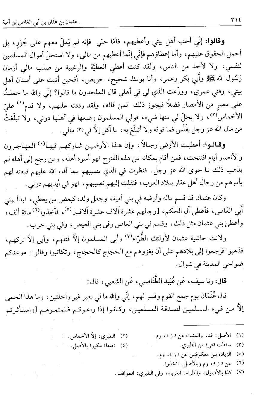 وقالوا إني أحب أهل بيتي وأعطيهم فأما حبي فإنه لم يمل معهم على جور بل أحمل الحقوق عليهم وأما إعطاؤهم فإني إنما أعطيهم من مالي ولا أستحل أموال المسلمين لنفسي ولا لأحد من الناس ولقد كنت أعطي العطية والرغيبة من صلب مالي أزمان رسول الله (صلى الله عليه وسلم) وأبي بكر وعمر وأنا يومئذ شحيح حريص أفحين أتيت على أسنان أهل بيتي وفني عمري ووزعت الذي لي في أهلي قال الملحدون ما قالوا إني والله ما حملت على مصر من الأمصار فضلا فيجوز ذلك لمن قاله ولقد رددته عليهم ولا قدم (1) علي الأخماس (2) ولا يحل لي منها شئ فولي المسلمون وضعها في أهلها دوني ولا تبلغت من مال الله عز وجل بفلس فما فوقه ولا أتبلغ به ما آكل إلا في (3) مالي وقالوا أعطيت الأرض رجالا وإن هذا الأرضين شاركهم فيها (4) المهاجرون والأنصار أيام افتتحت فمن أقام بمكانه من هذه الفتوح فهو أسوة أهله ومن رجع إلى أهله لم يذهب ذلك ما حوى الله عز وجل فنظرت في الذي يصيبهم مما أفاء الله عليهم فبعته لهم بأمرهم من رجال أهل عقار ببلاد العرب فنقلت إليهم نصيبهم فهو في أيديهم دوني وكان عثمان قد قسم ماله وأرضه في بني أمية وجعل ولده كبعض من يعطي فبدأ ببني أبي العاص فأعطى آل الحكم [رجالهم عشرة آلاف عشرة آلاف] (5) فأخذوا (6) مائة ألف وأعطى بني عثمان مثل ذلك وقسم في بني العاص وفي بني العيص وفي بني حرب ولانت حاشية عثمان لأولئك الطراء (7) وأبى المسلمون إلا قتلهم وأبى إلا تركهم فذهبوا فرجعوا إلى بلادهم على أن يغزوهم مع الحجاج كالحجاج وتكاتبوا وقالوا موعدكم ضواحي المدينة في شوال قال ونا سيف عن عبيد الطنافسي عن الشعبي قال قال عثمان يوم جمع القوم وفسر لهم إني والله ما لي بعير غير راحلتين وما هذا الحمى إلا من فئ المسلمين لصدقة المسلمين وكانوا إذا راعوكم ظلمتموهم [واستأثرتم