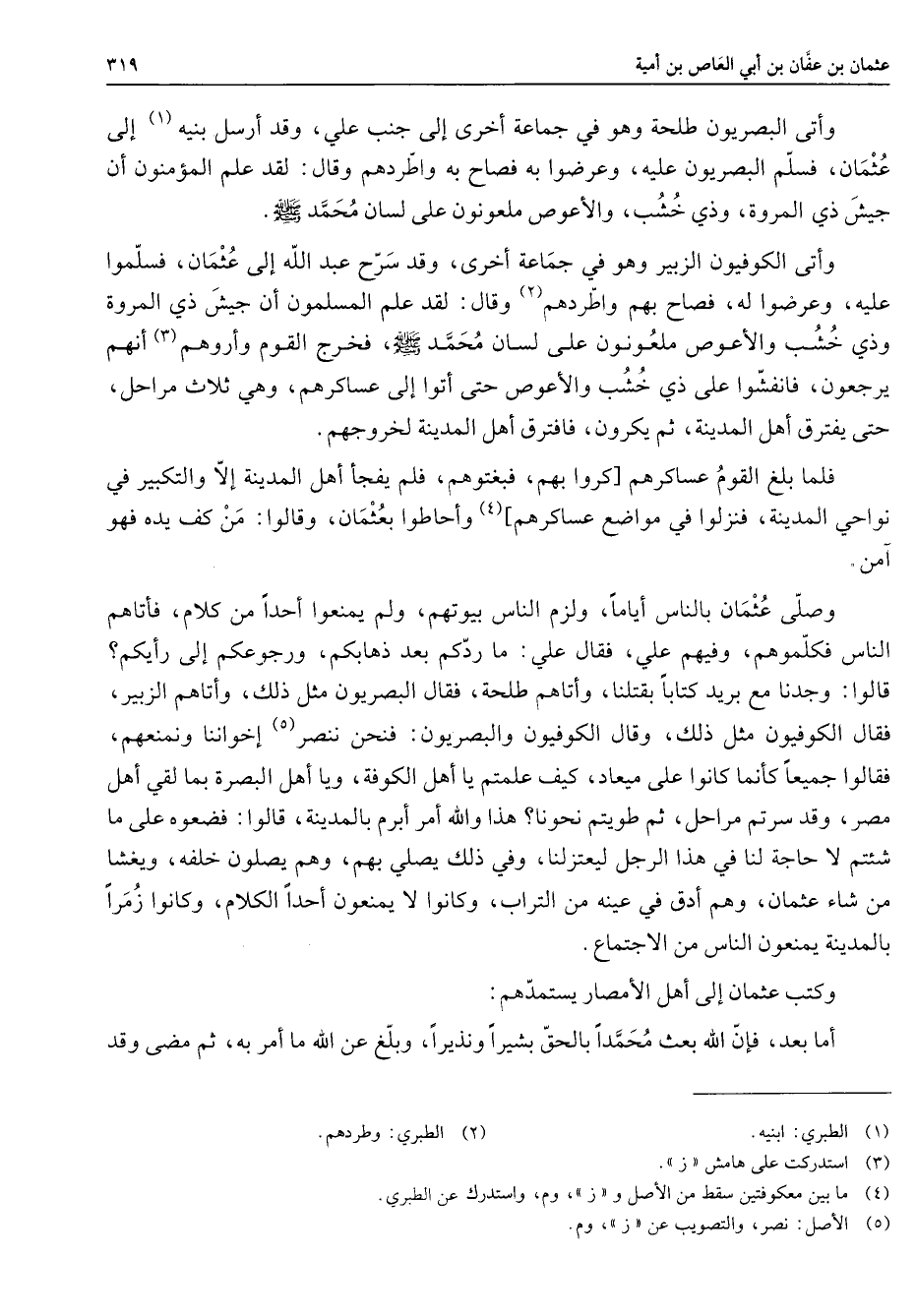 وأتى البصريون طلحة وهو في جماعة أخرى إلى جنب علي وقد أرسل بنيه (1) إلى عثمان فسلم البصريون عليه وعرضوا به فصاح به واطردهم وقال لقد علم المؤمنون أن جيش ذي المروة وذي خشب والأعوص ملعونون على لسان محمد (صلى الله عليه وسلم) وأتى الكوفيون الزبير وهو في جماعة أخرى وقد سرح عبد الله إلى عثمان فسلموا عليه وعرضوا له فصاح بهم واطردهم (2) وقال لقد علم المسلمون أن جيش ذي المروة وذي خشب والأعوص ملعونون على لسان محمد (صلى الله عليه وسلم) فخرج القوم وأروهم (3) أنهم يرجعون فانفشوا على ذي خشب والأعوص حتى أتوا إلى عساكرهم وهي ثلاث مراحل حتى يفترق أهل المدينة ثم يكرون فافترق أهل المدينة لخروجهم فلما بلغ القوم عساكرهم [كروا بهم فبغتوهم فلم يفجأ أهل المدينة إلا والتكبير في نواحي المدينة فنزلوا في مواضع عساكرهم] (4) وأحاطوا بعثمان وقالوا من كف يده فهو آمن وصلى عثمان بالناس أياما ولزم الناس بيوتهم ولم يمنعوا أحدا من كلام فأتاهم الناس فكلموهم وفيهم علي فقال علي ما ردكم بعد ذهابكم ورجوعكم إلى رأيكم قالوا وجدنا مع بريد كتابا بقتلنا وأتاهم طلحة فقال البصريون مثل ذلك وأتاهم الزبير فقال الكوفيون مثل ذلك وقال الكوفيون والبصريون فنحن ننصر (5) إخواننا ونمنعهم فقالوا جميعا كأنما كانوا على ميعاد كيف علمتم يا أهل الكوفة ويا أهل البصرة بما لقي أهل مصر وقد سرتم مراحل ثم طويتم نحونا هذا والله أمر أبرم بالمدينة قالوا فضعوه على ما شئتم لا حاجة لنا في هذا الرجل ليعتزلنا وفي ذلك يصلي بهم وهم يصلون خلفه ويغشا من شاء عثمان وهم أدق في عينه من التراب وكانوا لا يمنعون أحدا الكلام وكانوا زمرا بالمدينة يمنعون الناس من الاجتماع وكتب عثمان إلى أهل الأمصار يستمدهم أما بعد فإن الله بعث محمدا بالحق بشيرا ونذيرا وبلغ عن الله ما أمر به ثم مضى وقد