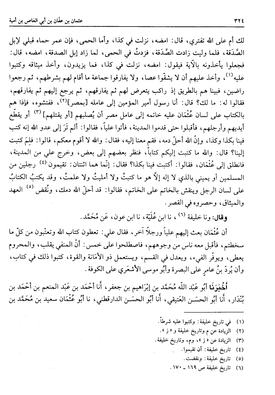 لك أم على الله تفتري قال امضه نزلت في كذا وأما الحمى فإن عمر حماه قبلي لإبل الصدقة فلما وليت زادت الصدقة فزدت في الحمى لما زاد إبل الصدقة امضه قال فجعلوا يأخذونه بالآية فيقول امضه نزلت في كذا فما يزيدون وأخذ ميثاقه وكتبوا عليه (1) وأخذ عليهم أن لا يشقوا عصا ولا يفارقوا جماعة ما أقام لهم بشرطهم ثم رجعوا راضين فبينا هم بالطريق إذ راكب يتعرض لهم ثم يفارقهم ثم يرجع إليهم ثم يفارقهم فقالوا له مالك قال أنا رسول أمير المؤمنين إلى عامله [بمصر] (2) ففتشوه فإذا هم بالكتاب على لسان عثمان عليه خاتمه إلى عامل مصر أن يصلبهم [أو يقتلهم] (3) أو يقطع أيديهم وأرجلهم فأقبلوا حتى قدموا المدينة فأتوا عليا فقالوا ألم تر إلى عدو الله إنه كتب فينا بكذا وكذا وإن الله أحل دمه فقم معنا إليه فقال والله لا أقوم معكم قالوا فلم كتبت إلينا قال والله ما كتبت إليكم كتابا فنظر بعضهم إلى بعض وخرج علي من المدينة فانطلق إلى عثمان فقالوا أكتبت فينا بكذا فقال إنما هما اثنتان تقيمون (4) رجلين من المسلمين أو يميني بالذي لا إله إلا هو ما كتبت ولا أمليت ولا علمت وقد يكتب الكتاب على لسان الرجل وينقش بالخاتم على الخاتم فقالوا قد أحل الله دمك ونقض (5) العهد والميثاق وحصروه في القصر وقال ونا خليفة (6) نا ابن علية نا ابن عون عن محمد أن عثمان بعث إليهم عليا ورجلا آخر فقال علي تعطون كتاب الله وتعتبون من كل ما سخطتم فأقبل معه ناس من وجوههم فاصطلحوا عل خمس أن المنفي يقلب والمحروم يعطى ويوفر الفئ ويعدل في القسم ويستعمل ذو الأمانة والقوة كتبوا ذلك في كتاب وأن يرد بن عامر على البصرة وأبو موسى الأشعري على الكوفة أخبرنا أبو عبد الله محمد بن إبراهيم بن جعفر أنا أحمد بن عبد المنعم بن أحمد بن بندار أنا أبو الحسن العتيقي أنا أبو الحسن الدارقطني نا أبو عثمان سعيد بن محمد بن