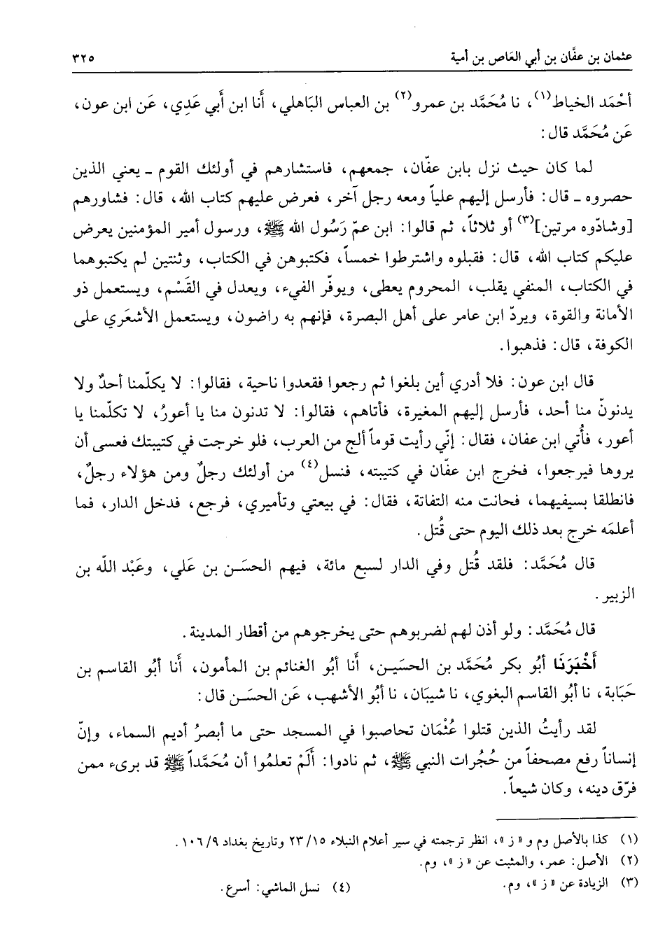 أحمد الخياط (1) نا محمد بن عمرو (2) بن العباس الباهلي أنا ابن أبي عدي عن ابن عون عن محمد قال لما كان حيث نزل بابن عفان جمعهم فاستشارهم في أولئك القوم يعني الذين حصروه قال فأرسل إليهم عليا ومعه رجل آخر فعرض عليهم كتاب الله قال فشاورهم [وشادوه مرتين] (3) أو ثلاثا ثم قالوا ابن عم رسول الله (صلى الله عليه وسلم) ورسول أمير المؤمنين يعرض عليكم كتاب الله قال فقبلوه واشترطوا خمسا فكتبوهن في الكتاب وثنتين لم يكتبوهما في الكتاب المنفي يقلب المحروم يعطى ويوفر الفئ ويعدل في القسم ويستعمل ذو الأمانة والقوة ويرد ابن عامر على أهل البصرة فإنهم به راضون ويستعمل الأشعري على الكوفة قال فذهبوا قال ابن عون فلا أدري أين بلغوا ثم رجعوا فقعدوا ناحية فقالوا لا يكلمنا أحد ولا يدنون منا أحد فأرسل إليهم المغيرة فأتاهم فقالوا لا تدنون منا يا أعور لا تكلمنا يا أعور فأتي ابن عفان فقال إني رأيت قوما ألج من العرب فلو خرجت في كتيبتك فعسى أن يروها فيرجعوا فخرج ابن عفان في كتيبته فنسل (4) من أولئك رجل ومن هؤلاء رجل فانطلقا بسيفيهما فحانت منه التفاتة فقال في بيعتي وتأميري فرجع فدخل الدار فما أعلمه خرج بعد ذلك اليوم حتى قتل قال محمد فلقد قتل وفي الدار لسبع مائة فيهم الحسن بن علي وعبد الله بن الزبير قال محمد ولو أذن لهم لضربوهم حتى يخرجوهم من أقطار المدينة أخبرنا أبو بكر محمد بن الحسين أنا أبو الغنائم بن المأمون أنا أبو القاسم بن حبابة نا أبو القاسم البغوي نا شيبان نا أبو الأشهب عن الحسن قال لقد رأيت الذين قتلوا عثمان تحاصبوا في المسجد حتى ما أبصر أديم السماء وإن إنسانا رفع مصحفا من حجرات النبي (صلى الله عليه وسلم) ثم نادوا ألم تعلموا أن محمدا (صلى الله عليه وسلم) قد برئ ممن فرق دينه وكان شيعا