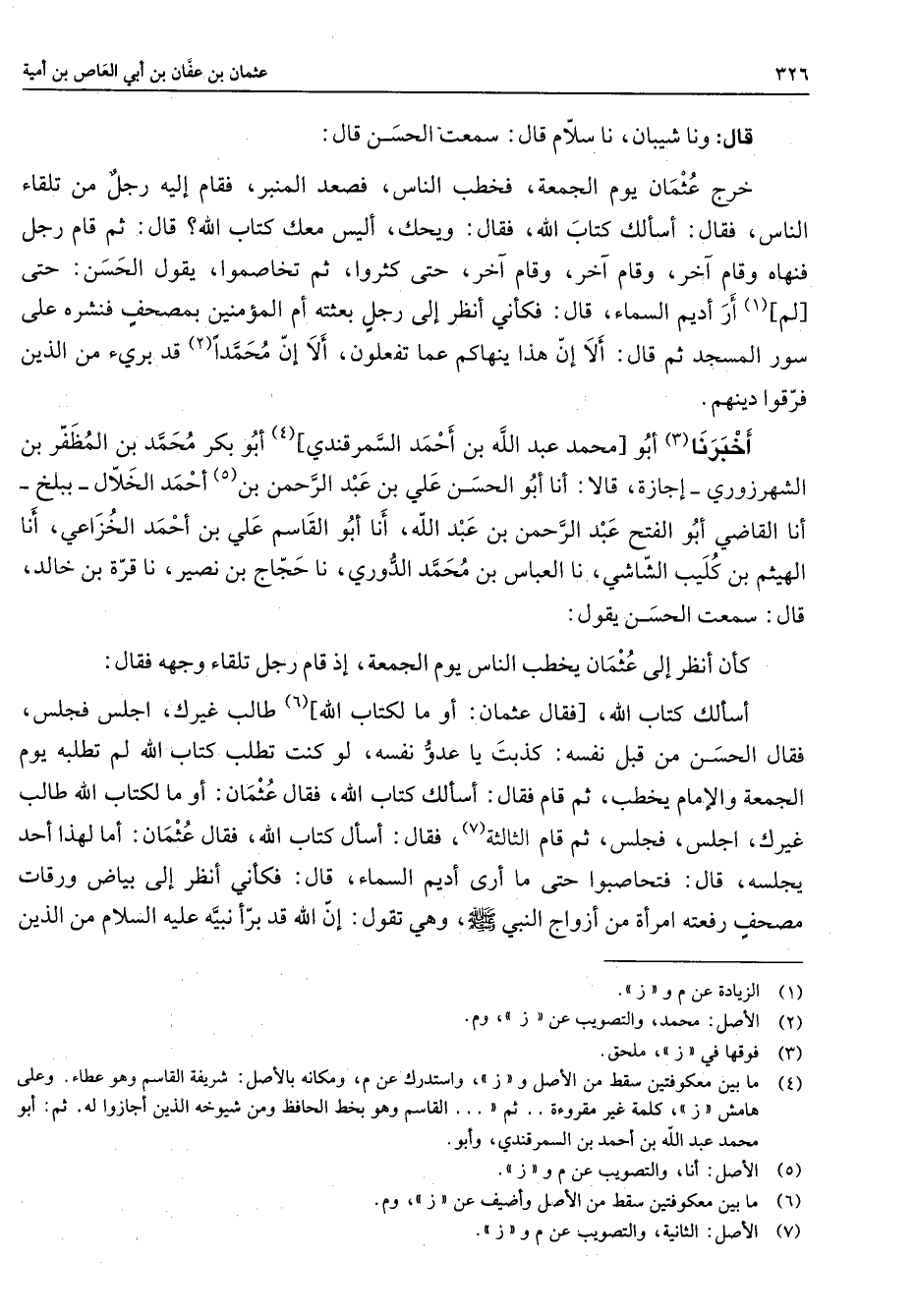 قال ونا شيبان نا سلام قال سمعت الحسن قال خرج عثمان يوم الجمعة فخطب الناس فصعد المنبر فقام إليه رجل من تلقاء الناس فقال أسألك كتاب الله فقال ويحك أليس معك كتاب الله قال ثم قام رجل فنهاه وقام آخر وقام آخر وقام آخر حتى كثروا ثم تخاصموا يقول الحسن حتى [لم] (1) أر أديم السماء قال فكأني أنظر إلى رجل بعثته أم المؤمنين بمصحف فنشره على سور المسجد ثم قال ألا إن هذا ينهاكم عما تفعلون ألا إن محمدا (2) قد برئ من الذين فرقوا دينهم أخبرنا (3) أبو [محمد عبد الله بن أحمد السمرقندي] (4) أبو بكر محمد بن المظفر بن الشهرزوري إجازة قالا أنا أبو الحسن علي بن عبد الرحمن بن (5) أحمد الخلال ببلخ أنا القاضي أبو الفتح عبد الرحمن بن عبد الله أنا أبو القاسم علي بن أحمد الخزاعي أنا الهيثم بن كليب الشاشي نا العباس بن محمد الدوري نا حجاج بن نصير نا قرة بن خالد قال سمعت الحسن يقول كأن أنظر إلى عثمان يخطب الناس يوم الجمعة إذ قام رجل تلقاء وجهه فقال أسالك كتاب الله [فقال عثمان أو ما لكتاب الله] (6) طالب غيرك اجلس فجلس فقال الحسن من قبل نفسه كذبت يا عدو نفسه لو كنت تطلب كتاب الله لم تطلبه يوم الجمعة والإمام يخطب ثم قام فقال أسألك كتاب الله فقال عثمان أو ما لكتاب الله طالب غيرك اجلس فجلس ثم قام الثالثة (7) فقال أسأل كتاب الله فقال عثمان أما لهذا أحد يجلسه قال فتحاصبوا حتى ما أرى أديم السماء قال فكأني أنظر إلى بياض ورقات مصحف رفعته امرأة من أزواج النبي (صلى الله عليه وسلم) وهي تقول إن الله قد برأ نبيه عليه السلام من الذين