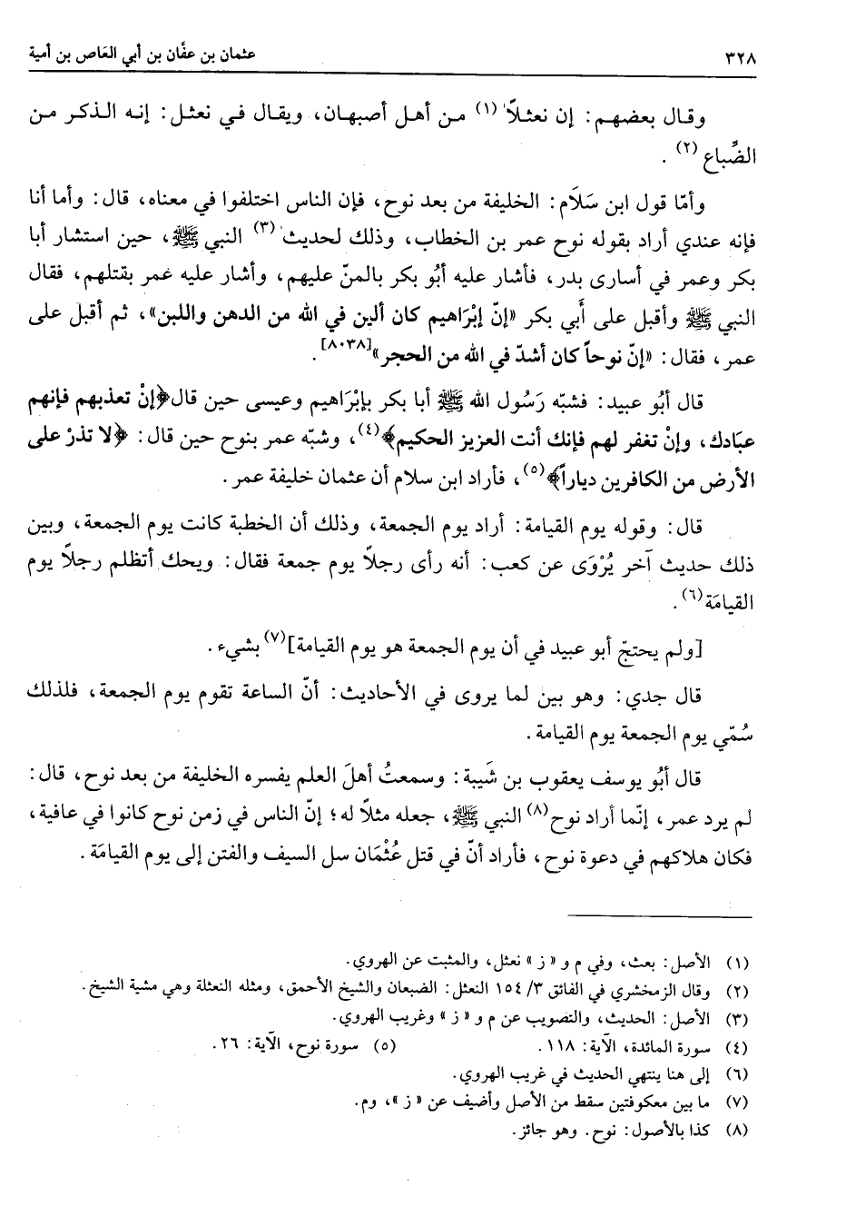 [8038] قال أبو عبيد فشبه رسول الله (صلى الله عليه وسلم) أبا بكر بإبراهيم وعيسى حين قال " إن تعذبهم فإنهم عبادك وإن تغفر لهم فإنك أنت العزيز الحكيم " (5) وشبه عمر بنوح حين قال " لا تذر على الأرض من الكافرين ديارا " (5) فأراد ابن سلام أن عثمان خليفة عمر قال وقوله يوم القيامة أراد يوم الجمعة وذلك أن الخطبة كانت يوم الجمعة وبين ذلك حديث آخر يروى عن كعب أنه رأى رجلا يوم جمعة فقال ويحك أتظلم رجلا يوم القيامة (6) [ولم يحتج أبو عبيد في أن يوم الجمعة هو يوم القيامة] (7) بشئ قال جدي وهو بين لما يروى في الأحاديث أن الساعة تقوم يوم الجمعة فلذلك سمي يوم الجمعة يوم القيامة قال أبو يوسف يعقوب بن شيبة وسمعت أهل العلم يفسره الخليفة من بعد نوح قال لم يرد عمر إنما أراد نوح (8) النبي (صلى الله عليه وسلم) جعله مثلا له إن الناس في زمن نوح كانوا في عافية فكان هلاكهم في دعوة نوح فأراد أن في قتل عثمان سل السيف والفتن إلى يوم القيامة