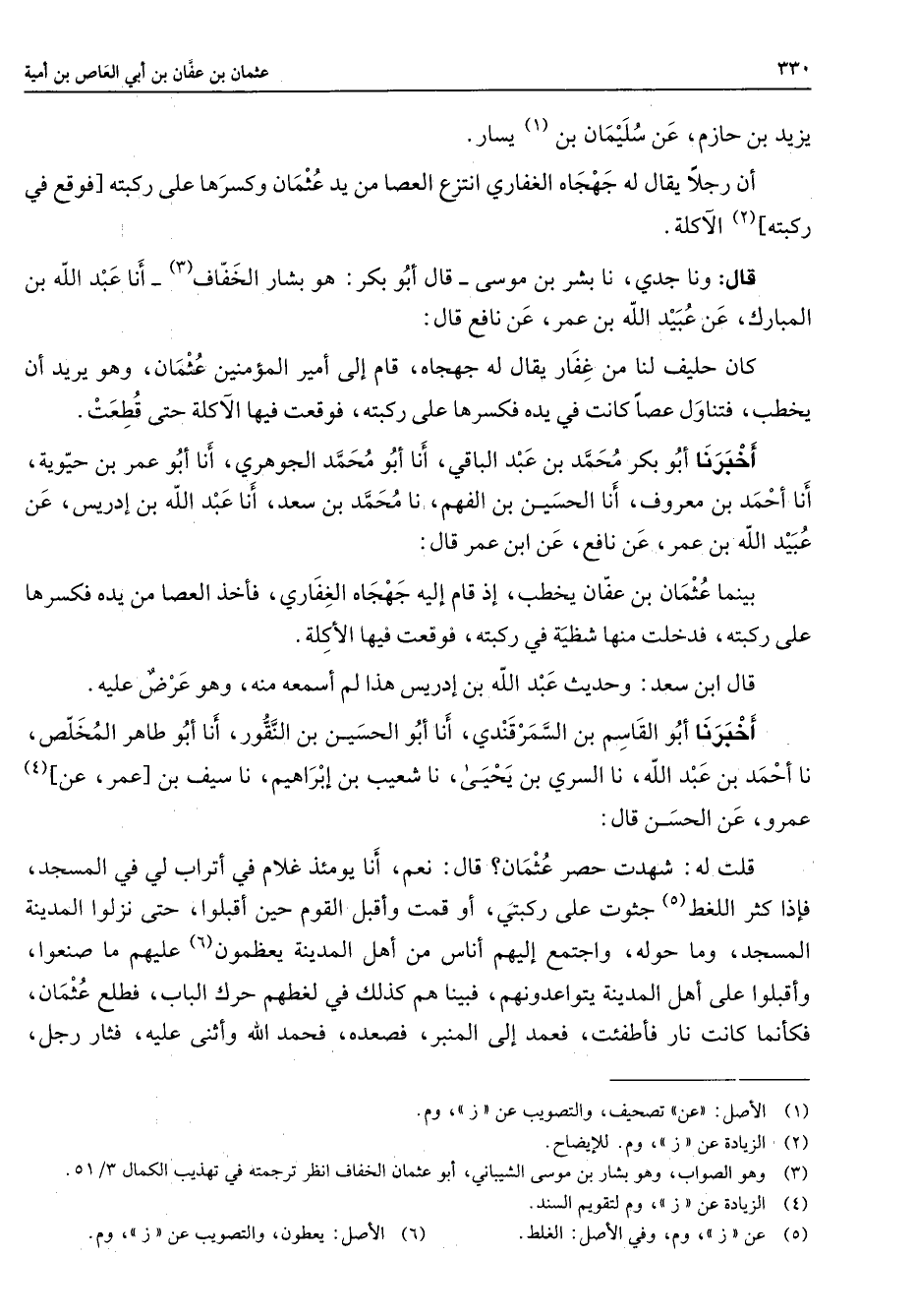 يزيد بن حازم عن سليمان بن (1) يسار أن رجلا يقال له جهجاه الغفاري انتزع العصا من يد عثمان وكسرها على ركبته [فوقع في ركبته] (2) الآكلة قال ونا جدي نا بشر بن موسى قال أبو بكر هو بشار الخفاف (3) أنا عبد الله بن المبارك عن عبيد الله بن عمر عن نافع قال كان حليف لنا من غفار يقال له جهجاه قام إلى أمير المؤمنين عثمان وهو يريد أن يخطب فتناول عصا كانت في يده فكسرها على ركبته فوقعت فيها الآكلة حتى قطعت أخبرنا أبو بكر محمد بن عبد الباقي أنا أبو محمد الجوهري أنا أبو عمر بن حيوية أنا أحمد بن معروف أنا الحسين بن الفهم نا محمد بن سعد أنا عبد الله بن إدريس عن عبيد الله بن عمر عن نافع عن ابن عمر قال بينما عثمان بن عفان يخطب إذ قام إليه جهجاه الغفاري فأخذ العصا من يده فكسرها على ركبته فدخلت منها شظية في ركبته فوقعت فيه الأكلة قال ابن سعد وحديث عبد الله بن إدريس هذا لم أسمعه منه وهو عرض عليه أخبرنا أبو القاسم بن السمرقندي أنا أبو الحسين بن النقور أنا أبو طاهر المخلص نا أحمد بن عبد الله نا السري بن يحيى نا شعيب بن إبراهيم نا سيف بن [عمر عن] (4) عمرو عن الحسن قال قلت له شهدت حصر عثمان قال نعم أنا يومئذ غلام في أتراب لي في المسجد فإذا كثر اللغط (5) جثوت على ركبتي أو قمت وأقبل القوم حين أقبلوا حتى نزلوا المدينة المسجد وما حوله واجتمع إليهم أناس من أهل المدينة يعظمون (6) عليهم ما صنعوا وأقبلوا على أهل المدينة يتواعدونهم فبينا هم كذلك في لغطهم حرك الباب فطلع عثمان فكأنما كانت دار فأطفئت فعمد إلى المنبر فصعده فحمد الله وأثنى عليه فثار رجل