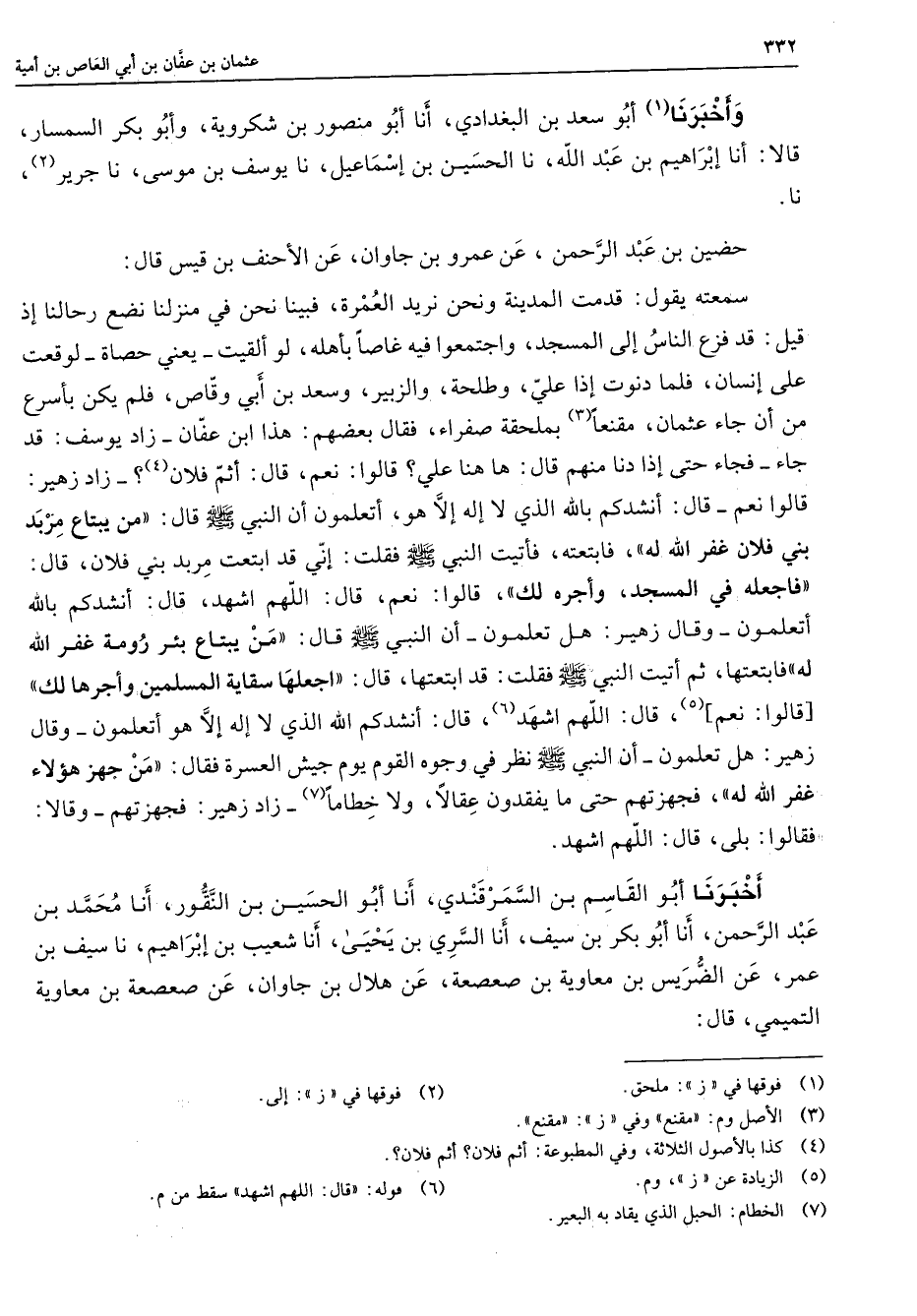 وأخبرنا (1) أبو سعد بن البغدادي أنا أبو منصور بن شكروية وأبو بكر السمسار قالا أنا إبراهيم بن عبد الله نا الحسين بن إسماعيل نا يوسف بن موسى نا جرير (2) نا حضين بن عبد الرحمن عن عمرو بن جاوان عن الأحنف بن قيس قال سمعته يقول قدمت المدينة ونحن نريد العمرة فبينا نحن في منزلنا نضع رحالنا إذ قيل قد فزع الناس إلى المسجد واجتمعوا فيه غاصا بأهله لو ألقيت يعني حصاة لوقعت على إنسان فلما دنوت إذا علي وطلحة والزبير وسعد بن أبي وقاص فلم يكن بأسرع من أن جاء عثمان مقنعا (3) بملحقة صفراء فقال بعضهم هذا ابن عفان زاد يوسف قد جاء فجاء حتى إذا دنا منهم قال ها هنا علي قالوا نعم قال أثم فلان (4) زاد زهير قالوا نعم قال أنشدكم بالله الذي لا إله إلا هو أتعلمون أن النبي (صلى الله عليه وسلم) قال من يبتاع مربد بني فلان غفر الله له فابتعته فأتيت النبي (صلى الله عليه وسلم) فقلت إني قد ابتعت مربد بني فلان قال فاجعله في المسجد وأجره لك قالوا نعم قال اللهم اشهد قال أنشدكم بالله أتعلمون وقال زهير هل تعلمون أن النبي (صلى الله عليه وسلم) قال من يبتاع بئر رومة غفر الله له فابتعتها ثم أتيت النبي (صلى الله عليه وسلم) فقلت قد ابتعتها قال اجعلها سقاية المسلمين وأجرها لك [قالوا نعم] (5) قال اللهم اشهد (6) قال أنشدكم الله الذي لا إله إلا هو أتعلمون وقال زهير هل تعلمون أن النبي (صلى الله عليه وسلم) نظر في وجوه القوم يوم جيش العسرة فقال من جهز هؤلاء غفر الله له فجهزتهم حتى ما يفقدون عقالا ولا خطاما (7) زاد زهير فجهزتهم وقالا فقالوا بلى قال اللهم اشهد أخبرنا أبو القاسم بن السمرقندي أنا أبو الحسين بن النقور أنا محمد بن عبد الرحمن أنا أبو بكر بن سيف أنا السري بن يحيى أنا شعيب بن إبراهيم نا سيف بن عمر عن الضريس بن معاوية بن صعصعة عن هلال بن جاوان عن صعصعة بن معاوية التميمي قال