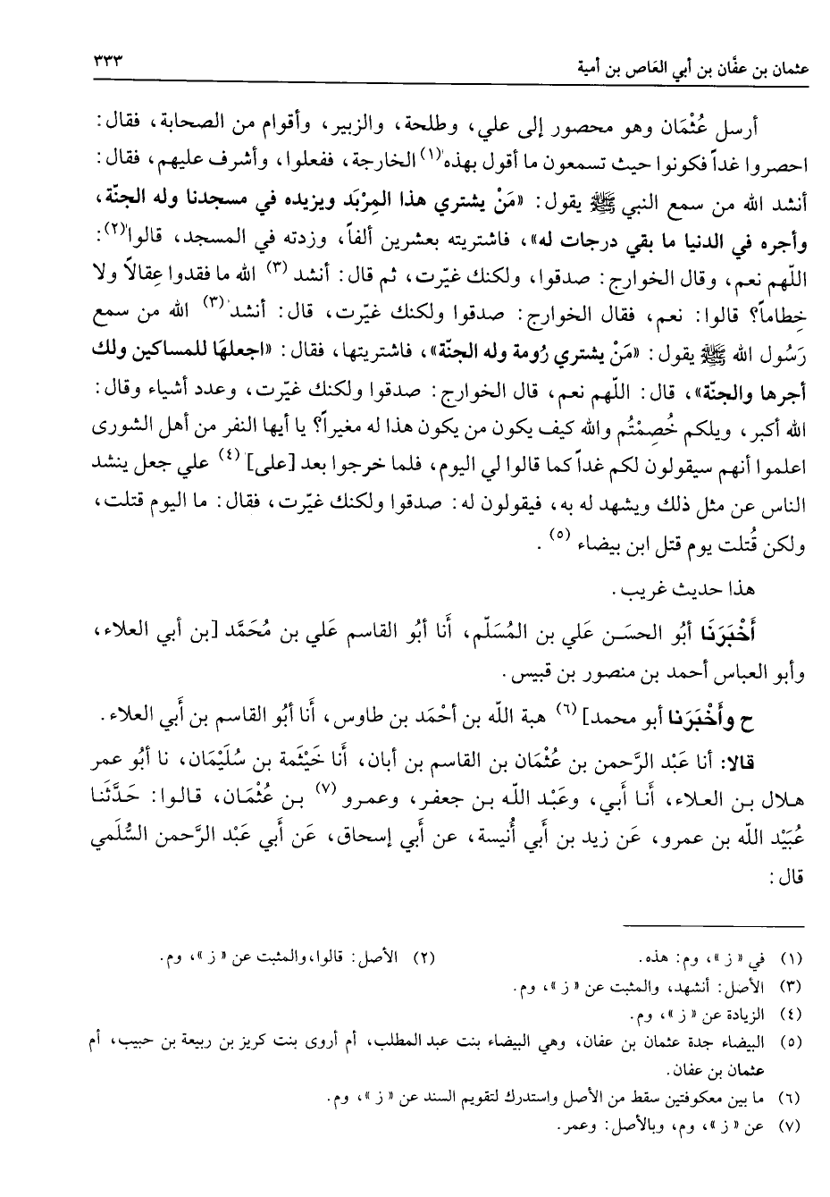 أرسل عثمان وهو محصور إلى علي وطلحة والزبير وأقوام من الصحابة فقال احصروا غدا فكونوا حيث تسمعون ما أقول بهذه (1) الخارجة ففعلوا وأشرف عليهم فقال أنشد الله من سمع النبي (صلى الله عليه وسلم) يقول من يشتري هذا المربد ويزيده في مسجدنا وله الجنة وأجره في الدنيا ما بقي درجات له فاشتريته بعشرين ألفا وزدته في المسجد قالوا (2) اللهم نعم وقال الخوارج صدقوا ولكنك غيرت ثم قال أنشد (3) الله ما فقدوا عقالا ولا خطاما قالوا نعم فقال الخوارج صدقوا ولكنك غيرت قال أنشد الله من سمع رسول الله (صلى الله عليه وسلم) يقول من يشتري رومة وله الجنة فاشتريتها فقال اجعلها للمساكين ولك أجرها والجنة قال اللهم نعم قال الخوارج صدقوا ولكنك غيرت وعدد أشياء وقال الله أكبر ويلكم خصمتم والله كيف يكون من يكون هذا له مغيرا يا أيها النفر من أهل الشورى اعلموا أنهم سيقولون لكم غدا كما قالوا لي اليوم فلما خرجوا بعد [على] (4) علي جعل ينشد الناس عن مثل ذلك ويشهد له به فيقولون له صدقوا ولكنك غيرت فقال ما اليوم قتلت ولكن قتلت يوم قتل ابن بيضاء (5) هذا حديث غريب أخبرنا أبو الحسن علي بن المسلم أنا أبو القاسم علي بن محمد [بن أبي العلاء وأبو العباس أحمد بن منصور بن قبيس ح وأخبرنا أبو محمد] (6) هبة الله بن أحمد بن طاوس أنا أبو القاسم بن أبي العلاء قالا أنا عبد الرحمن بن عثمان بن القاسم بن أبان أنا خيثمة بن سليمان نا أبو عمر هلال بن العلاء أنا أبي وعبد الله بن جعفر وعمرو (7) بن عثمان قالوا حدثنا عبيد الله بن عمرو عن زيد بن أبي أنيسة عن أبي إسحاق عن أبي عبد الرحمن السلمي قال