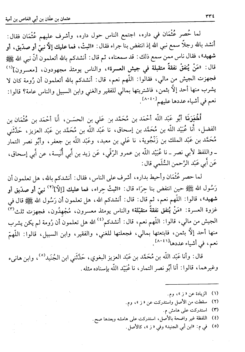 لما حصر عثمان في داره اجتمع الناس حول داره وأشرف عليهم عثمان فقال أنشد بالله رجلا سمع نبي الله إذ انتفض بنا جراء فقال اثبت فما عليك إلا نبي أو صديق أو شهيد فقال ناس ممن سمع ذلك قد سمعناه ثم قال أنشدكم بالله أتعلمون أن نبي الله (صلى الله عليه وسلم) قال من ينفق نفقة متقبلة في جيش العسرة والناس يومئذ مجهودون [معسرون] (1) فجهزت الجيش من مالي فقالوا اللهم نعم قال أنشدكم بالله أتعلمون أن رومة كان لا يشرب منها أحد إلا بثمن فاشتريتها بمالي للفقير والغني وابن السبيل والناس عامة قالوا نعم في أشياء عددها عليهم