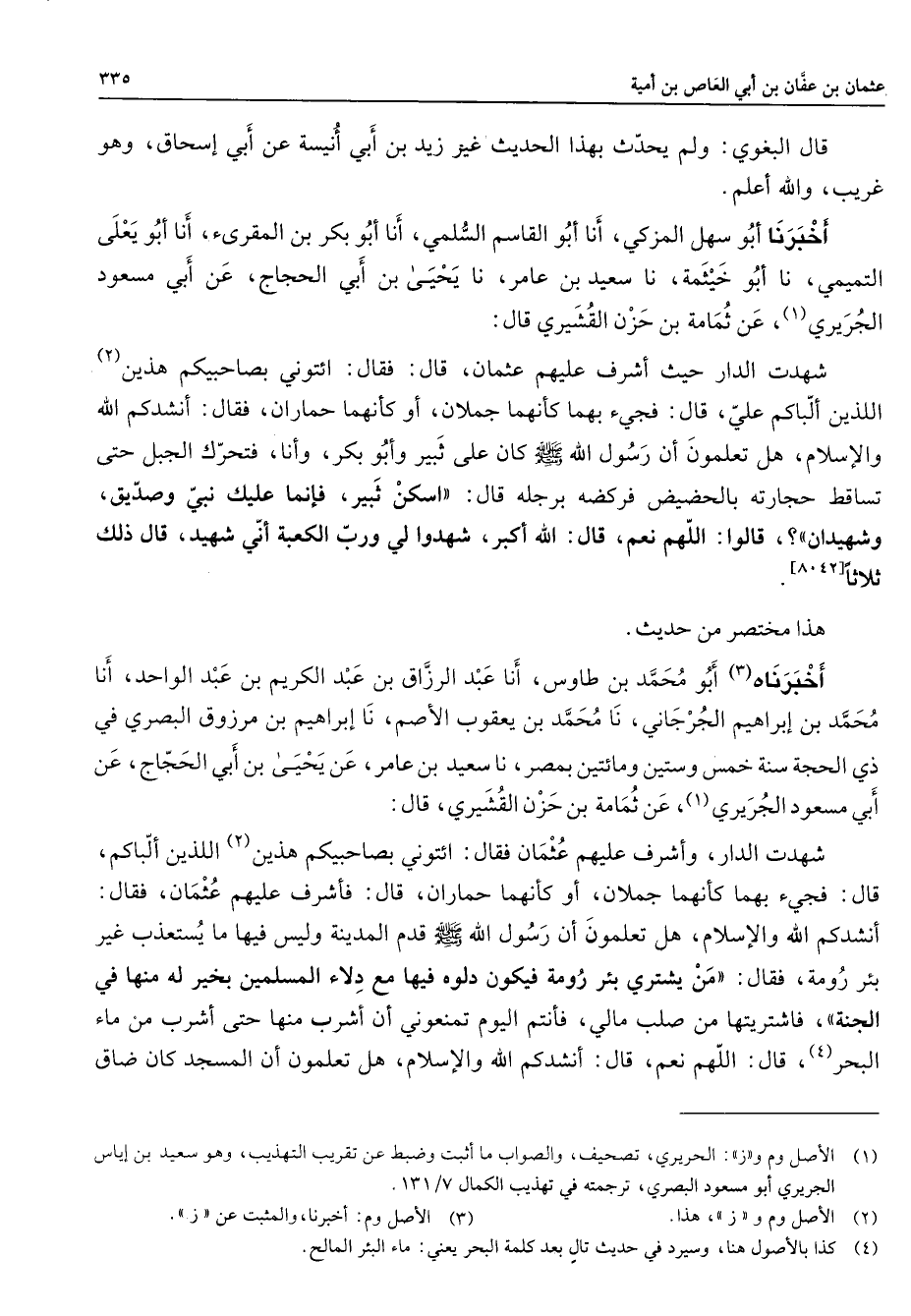 [8042] هذا مختصر من حديث أخبرناه (3) أبو محمد بن طاوس أنا عبد الرزاق بن عبد الكريم بن عبد الواحد أنا محمد بن إبراهيم الجرجاني نا محمد بن يعقوب الأصم نا إبراهيم بن مرزوق البصري في ذي الحجة سنة خمس وستين ومائتين بمصر نا سعيد بن عامر عن يحيى بن أبي الحجاج عن أبي مسعود الجريري (1) عن ثمامة بن حزن القشيري قال شهدت الدار وأشرف عليهم عثمان فقال ائتوني بصاحبيكم هذين (2) اللذين ألباكم قال فجئ بهما كأنهما جملان أو كأنهما حماران قال فأشرف عليهم عثمان فقال أنشدكم الله والإسلام هل تعلمون أن رسول الله (صلى الله عليه وسلم) قدم المدينة وليس فيها ما يستعذب غير بئر رومة فقال من يشتري بئر رومة فيكون دلوه فيها مع دلاء المسلمين بخير له منها في الجنة فاشتريتها من صلب مالي فأنتم اليوم تمنعوني أن أشرب منها حتى أشرب من ماء البحر قال اللهم نعم قال أنشدكم الله والإسلام هل تعلمون أن المسجد كان ضاق