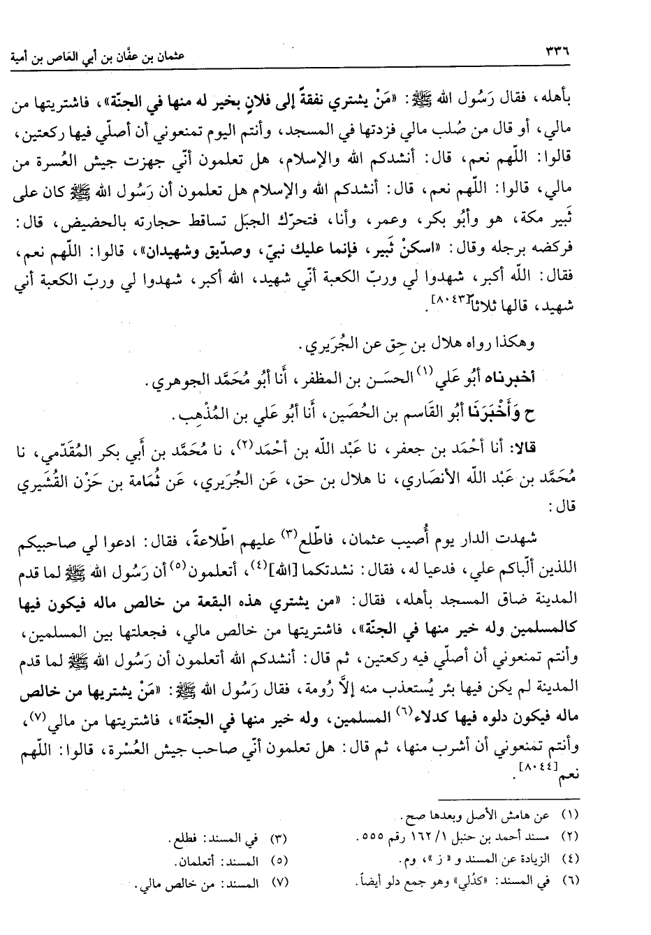 [8043] وهكذا رواه هلال بن حق عن الجريري أخبرناه أبو علي (1) الحسن بن المظفر أنا أبو محمد الجوهري ح وأخبرنا أبو القاسم بن الحصين أنا أبو علي بن المذهب قالا أنا أحمد بن جعفر نا عبد الله بن أحمد (2) نا محمد بن أبي بكر المقدمي نا محمد بن عبد الله الأنصاري نا هلال بن حق عن الجريري عن ثمامة بن حزن القشيري قال شهدت الدار يوم أصيب عثمان فاطلع (3) عليهم اطلاعة فقال ادعوا لي صاحبيكم اللذين ألباكم علي فدعيا له فقال نشدتكما [الله] (4) أتعلمون (5) أن رسول الله (صلى الله عليه وسلم) لما قدم المدينة ضاق المسجد بأهله فقال من يشتري هذه البقعة من خالص ماله فيكون فيها كالمسلمين وله خير منها في الجنة فاشتريتها من خالص مالي فجعلتها بين المسلمين وأنتم تمنعوني أن أصلي فيه ركعتين ثم قال أنشدكم الله أتعلمون أن رسول الله (صلى الله عليه وسلم) لما قدم المدينة لم يكن فيها بئر يستعذب منه إلارومة فقال رسول الله (صلى الله عليه وسلم) من يشتريها من خالص ماله فيكون دلوه فيها كدلاء (6) المسلمين وله خير منها في الجنة فاشتريتها من مالي (7) وأنتم تمنعوني أن أشرب منها ثم قال هل تعلمون أني صاحب جيش العسرة قالوا اللهم نعم