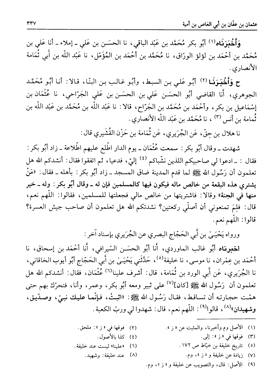 وأخبرناه (1) أبو بكر محمد بن عبد الباقي نا الحسن بن علي إملاء أنا علي بن محمد بن أحمد بن لؤلؤ الوراق نا محمد بن أحمد بن المؤمل نا عبد الله بن أبي ثمامة الأنصاري ح وأخبرنا (2) أبو علي بن السبط وأبو غالب بن البنا قالا أنا أبو محمد الجوهري أنا القاضي أبو الحسن علي بن الحسن بن علي الجراحي نا عثمان بن إسماعيل بن بكر وأحمد بن محمد بن الجراح قالا نا عبد الله بن محمد بن عبد الله بن ثمامة بن أنس (3) نا محمد بن عبد الله الأنصاري نا هلال بن حق عن الجريري عن ثمامة بن حزن القشيري قال شهدت وقال أبو بكر سمعت عثمان يوم الدار اطلع عليهم اطلاعة زاد أبو بكر فقال ادعوا لي صاحبيكم اللذين نشباكم (4) إلي فدعيا ثم اتفقوا فقال أنشدكم الله هل تعلمون أن رسول الله (صلى الله عليه وسلم) لما قدم المدينة ضاق المسجد زاد أبو بكر بأهله فقال من يشتري هذه البقعة من خالص ماله فيكون فيها كالمسلمين فإن له وقال أبو بكر وله خير منها في الجنة وقالا فاشتريتها من خالص مالي فجعلتها للمسلمين فقالوا اللهم نعم قال فلم تمنعوني أن أصلي ركعتين نشدتكم الله هل تعلمون أن صاحب جيش العسرة قالوا اللهم نعم ورواه يحيى بن أبي الحجاج البصري عن الجريري بإسناد آخر أخبرناه أبو غالب الماوردي أنا أبو الحسن السيرافي أنا أحمد بن إسحاق نا أحمد بن عمران نا موسى نا خليفة (5) حدثني يحيى بن أبي الحجاج أبو أيوب الخاقاني نا الجريري عن أبي الورد بن ثمامة قال أشرف علينا (6) عثمان فقال أنشدكم الله هل تعلمون أن رسول الله (صلى الله عليه وسلم) [كان] (7) على ثبير ومعه أبو بكر وعمر وأنا فتحرك بهم حتى همت حجارته أن تساقط فقال رسول الله (صلى الله عليه وسلم) اثبت فإنما عليك نبي وصديق وشهيدان (8) قالوا (9) اللهم نعم قال شهدوا لي ورب الكعبة