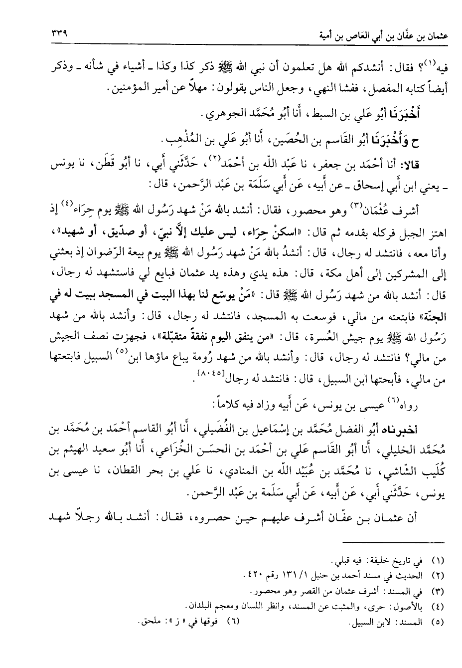 فيه (1) فقال أنشدكم الله هل تعلمون أن نبي الله (صلى الله عليه وسلم) ذكر كذا وكذا أشياء في شأنه وذكر أيضا كتابه المفصل ففشا النهي وجعل الناس يقولون مهلا عن أمير المؤمنين أخبرنا أبو علي بن السبط أنا أبو محمد الجوهري ح وأخبرنا أبو القاسم بن الحصين أنا أبو علي بن المذهب قالا أنا أحمد بن جعفر نا عبد الله بن أحمد (2) حدثني أبي نا أبو قطن نا يونس يعني ابن أبي إسحاق عن أبيه عن أبي سلمة بن عبد الرحمن قال أشرف عثمان (3) وهو محصور فقال أنشد بالله من شهد رسول الله (صلى الله عليه وسلم) يوم حراء (4) إذ اهتز الجبل فركله بقدمه ثم قال اسكن حراء ليس عليك إلا نبي أو صديق أو شهيد وأنا معه فانتشد له رجال قال أنشد بالله من شهد رسول الله (صلى الله عليه وسلم) يوم بيعة الرضوان إذ بعثني إلى المشركين إلى أهل مكة قال هذه يدي وهذه يد عثمان فبايع لي فاستشهد له رجال قال أنشد بالله من شهد رسول الله (صلى الله عليه وسلم) قال من يوسع لنا بهذا البيت في المسجد ببيت له في الجنة فابتعته من مالي فوسعت به المسجد فانتشد له رجال قال وأنشد بالله من شهد رسول الله (صلى الله عليه وسلم) يوم جيش العسرة قال من ينفق اليوم نفقة متقبلة فجهزت نصف الجيش من مالي فانتشد له رجال قال وأنشد بالله من شهد رومة يباع ماؤها ابن (5) السبيل فابتعتها من مالي فأبحتها ابن السبيل قال فانتشد له رجال