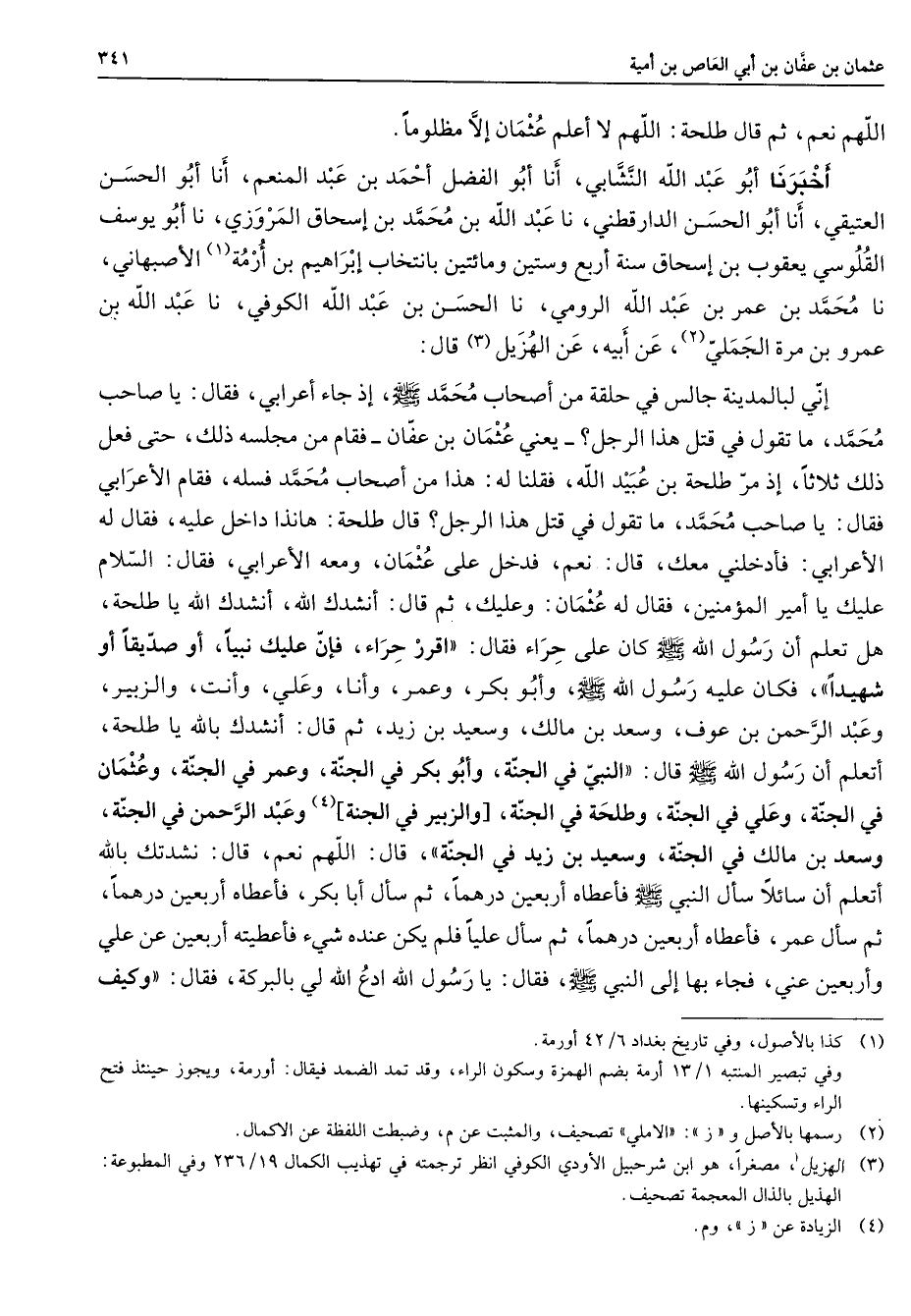 اللهم نعم ثم قال طلحة اللهم لا أعلم عثمان إلا مظلوما أخبرنا أبو عبد الله النشابي أنا أبو الفضل أحمد بن عبد المنعم أنا أبو الحسن العتيقي أنا أبو الحسن الدارقطني نا عبد الله بن محمد بن إسحاق المروزي نا أبو يوسف القلوسي يعقوب بن إسحاق سنة أربع وستين ومائتين بانتخاب إبراهيم بن أرمة (1) الأصبهاني نا محمد بن عمر بن عبد الله الرومي نا الحسن بن عبد الله الكوفي نا عبد الله بن عمرو بن مرة الجملي (2) عن أبيه عن الهزيل (3) قال إني لبالمدينة جالس في حلقة من أصحاب محمد (صلى الله عليه وسلم) إذ جاء أعرابي فقال يا صاحب محمد ما تقول في قتل هذا الرجل يعني عثمان بن عفان فقام من مجلسه ذلك حتى فعل ذلك ثلاثا إذ مر طلحة بن عبيد الله فقلنا له هذا من أصحاب محمد فسله فقام الأعرابي فقال يا صاحب محمد ما تقول في قتل هذا الرجل قال طلحة هانذا داخل عليه فقال له الأعرابي فأدخلني معك قال نعم فدخل على عثمان ومعه الأعرابي فقال السلام عليك يا أمير المؤمنين فقال له عثمان وعليك ثم قال أنشدك الله أنشدك الله يا طلحة هل تعلم أن رسول الله (صلى الله عليه وسلم) كان على حراء فقال اقرر حراء فإن عليك نبيا أو صديقا أو شهيدا فكان عليه رسول الله (صلى الله عليه وسلم) وأبو بكر وعمر وأنا وعلي وأنت والزبير وعبد الرحمن بن عوف وسعد بن مالك وسعيد بن زيد ثم قال أنشدك بالله يا طلحة أتعلم أن رسول الله (صلى الله عليه وسلم) قال النبي في الجنة وأبو بكر في الجنة وعمر في الجنة وعثمان في الجنة وعلي في الجنة وطلحة في الجنة [والزبير في الجنة] (4) وعبد الرحمن في الجنة وسعد بن مالك في الجنة وسعيد بن زيد في الجنة قال اللهم نعم قال نشدتك بالله أتعلم أن سائلا سأل النبي (صلى الله عليه وسلم) فأعطاه أربعين درهما ثم سأل أبا بكر فأعطاه أربعين درهما ثم سأل عمر فأعطاه أربعين درهما ثم سأل عليا فلم يكن عنده شئ فأعطيته أربعين عن علي وأربعين عني فجاء بها إلى النبي (صلى الله عليه وسلم) فقال يا رسول الله ادع الله لي بالبركة فقال وكيف