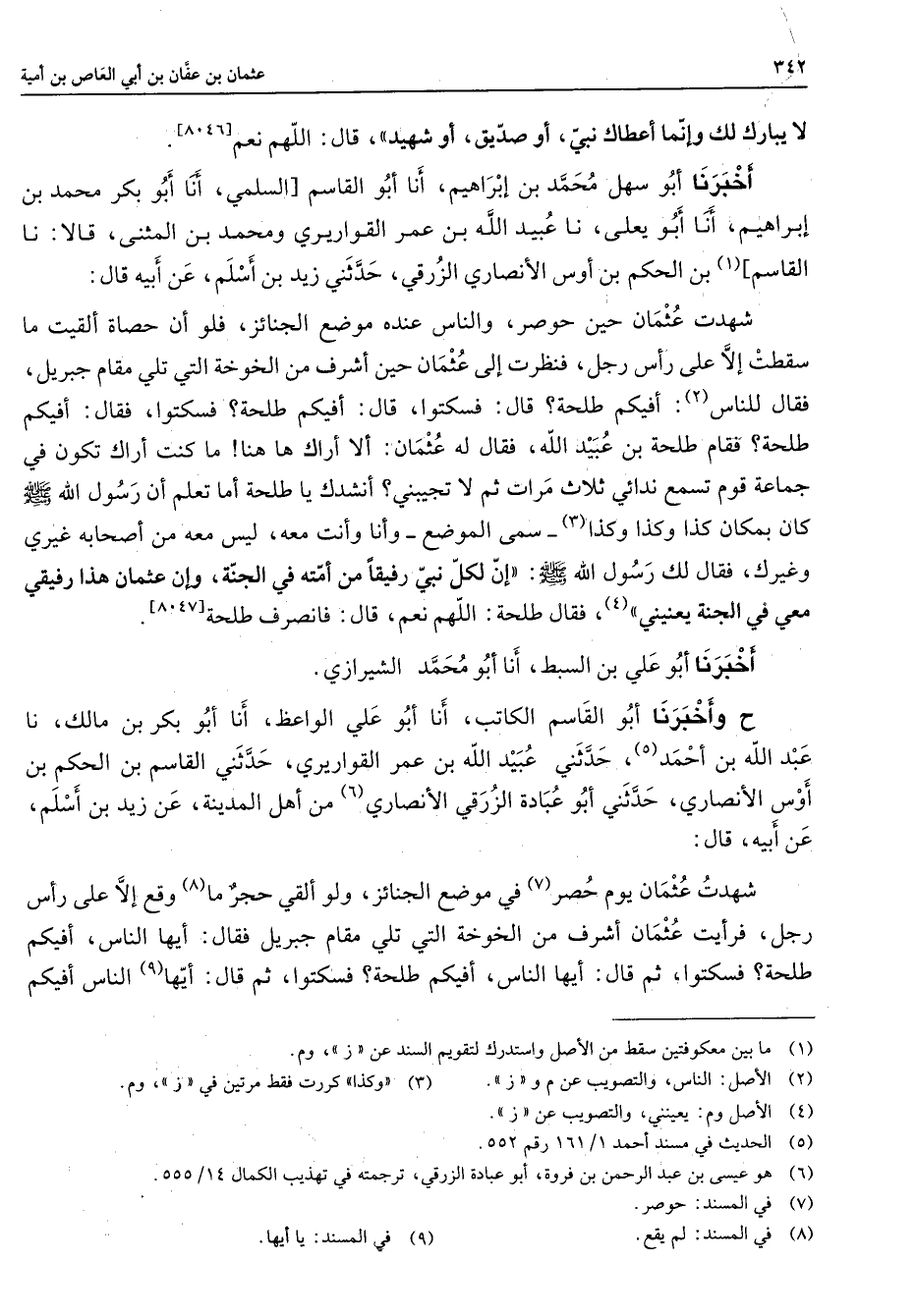 [8047] أخبرنا أبو علي بن السبط أنا أبو محمد الشيرازي ح وأخبرنا أبو القاسم الكاتب أنا أبو علي الواعظ أنا أبو بكر بن مالك نا عبد الله بن أحمد (5) حدثني عبيد الله بن عمر القواريري حدثني القاسم بن الحكم بن أوس الأنصاري حدثني أبو عبادة الزرقي الأنصاري (6) من أهل المدينة عن زيد بن أسلم عن أبيه قال شهدت عثمان يوم حصر (7) في موضع الجنائز ولو ألقي حجر ما (8) وقع إلا على رأس رجل فرأيت عثمان أشرف من الخوخة التي تلي مقام جبريل فقال أيها (9) الناس أفيكم طلحة فسكتوا ثم قال أيها الناس أفيكم طلحة فسكتوا ثم قال أيها الناس أفيكم