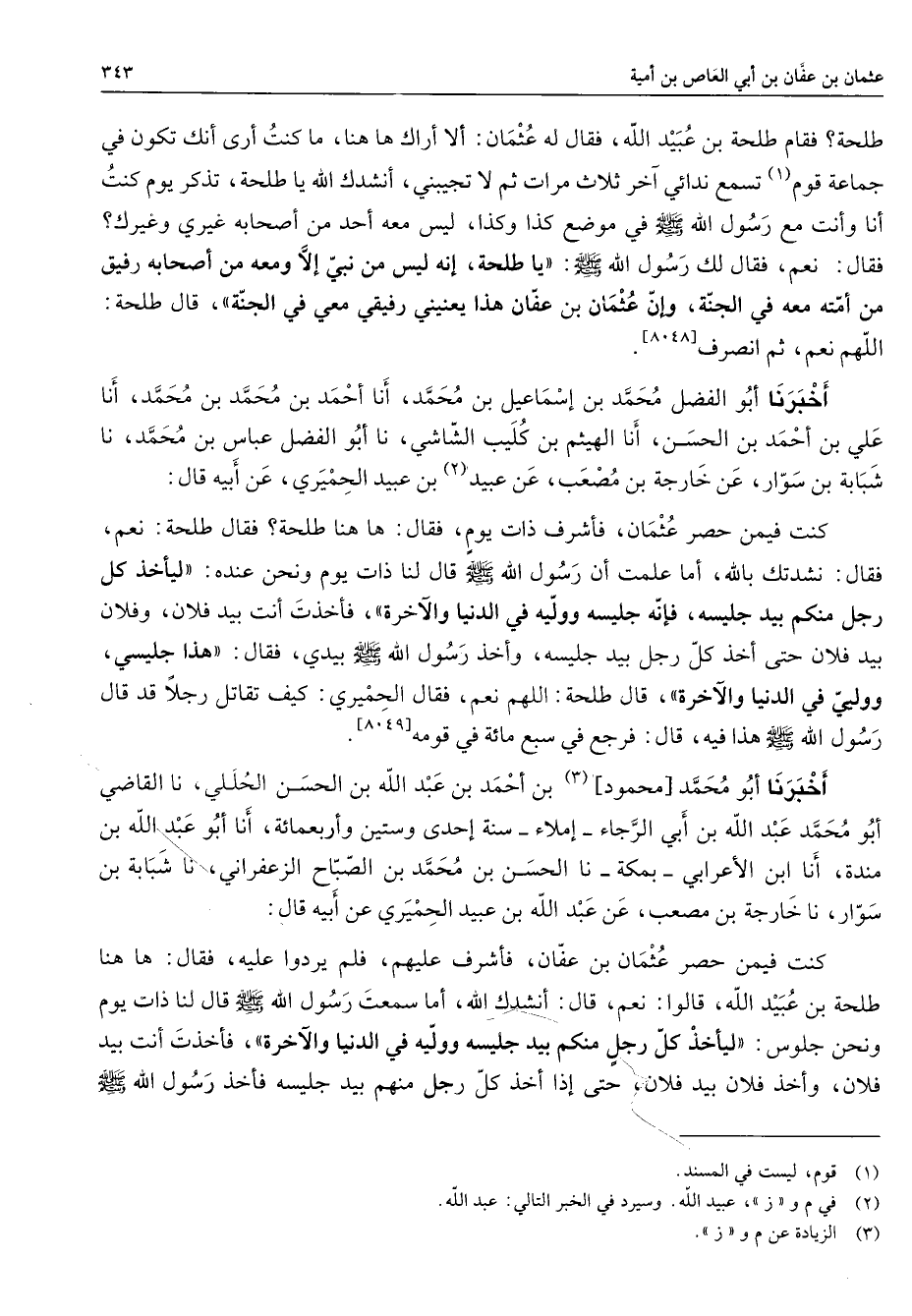 [8047] أخبرنا أبو الفضل محمد بن إسماعيل بن محمد أنا أحمد بن محمد بن محمد أنا علي بن أحمد بن الحسن أنا الهيثم بن كليب الشاشي نا أبو الفضل عباس بن محمد نا شبابة بن سوار عن خارجة بن مصعب عن عبيد (2) بن عبيد الحميري عن أبيه قال كنت فيمن حصر عثمان فأشرف ذات يوم فقال ها هنا طلحة فقال طلحة نعم فقال نشدتك بالله أما علمت أن رسول الله (صلى الله عليه وسلم) قال لنا ذات يوم ونحن عنده ليأخذ كل رجل منكم بيد جليسه فإنه جليسه ووليه في الدنيا والآخرة فأخذت أنت بيد فلان وفلان بيد فلان حتى أخذ كل رجل بيد جليسه وأخذ رسول الله (صلى الله عليه وسلم) بيدي فقال هذا جليسي ووليي في الدنيا والآخرة قال طلحة اللهم نعم فقال الحميري كيف تقاتل رجلا قد قال رسول الله (صلى الله عليه وسلم) هذا فيه قال فرجع في سبع مائة في قومه