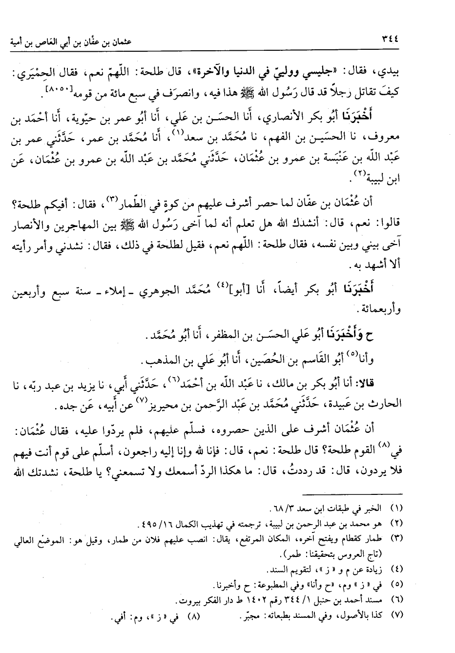 [8050] أخبرنا أبو بكر الأنصاري أنا الحسن بن علي أنا أبو عمر بن حيوية أنا أحمد بن معروف نا الحسين بن الفهم نا محمد بن سعد (1) أنا محمد بن عمر حدثني عمر بن عبد الله بن عنبسة بن عمرو بن عثمان حدثني محمد بن عبد الله بن عمرو بن عثمان عن ابن لبيبة (2) أن عثمان بن عفان لما حصر أشرف عليهم من كوة في الطمار (3) فقال أفيكم طلحة قالوا نعم قال أنشدك الله هل تعلم أنه لما آخى رسول الله (صلى الله عليه وسلم) بين المهاجرين والأنصار آخى بيني وبين نفسه فقال طلحة اللهم نعم فقيل لطلحة في ذلك فقال نشدني وأمر رأيته ألا أشهد به أخبرنا أبو بكر أيضا أنا [أبو] (4) محمد الجوهري إملاء سنة سبع وأربعين وأربعمائة ح وأخبرنا أبو علي الحسن بن المظفر أنا أبو محمد وأنا (5) أبو القاسم بن الحصين أنا أبو علي بن المذهب قالا أنا أبو بكر بن مالك نا عبد الله بن أحمد (6) حدثني أبي نا يزيد بن عبد ربه نا الحارث بن عبيدة حدثني محمد بن عبد الرحمن بن محيريز (7) عن أبيه عن جده أن عثمان أشرف على الذين حصروه فسلم عليهم فلم يردوا عليه فقال عثمان في (8) القوم طلحة قال طلحة نعم قال فإنا لله وإنا إليه راجعون أسلم على قوم أنت فيهم فلا يردون قال قد رددت قال ما هكذا الرد أسمعك ولا تسمعني يا طلحة نشدتك الله