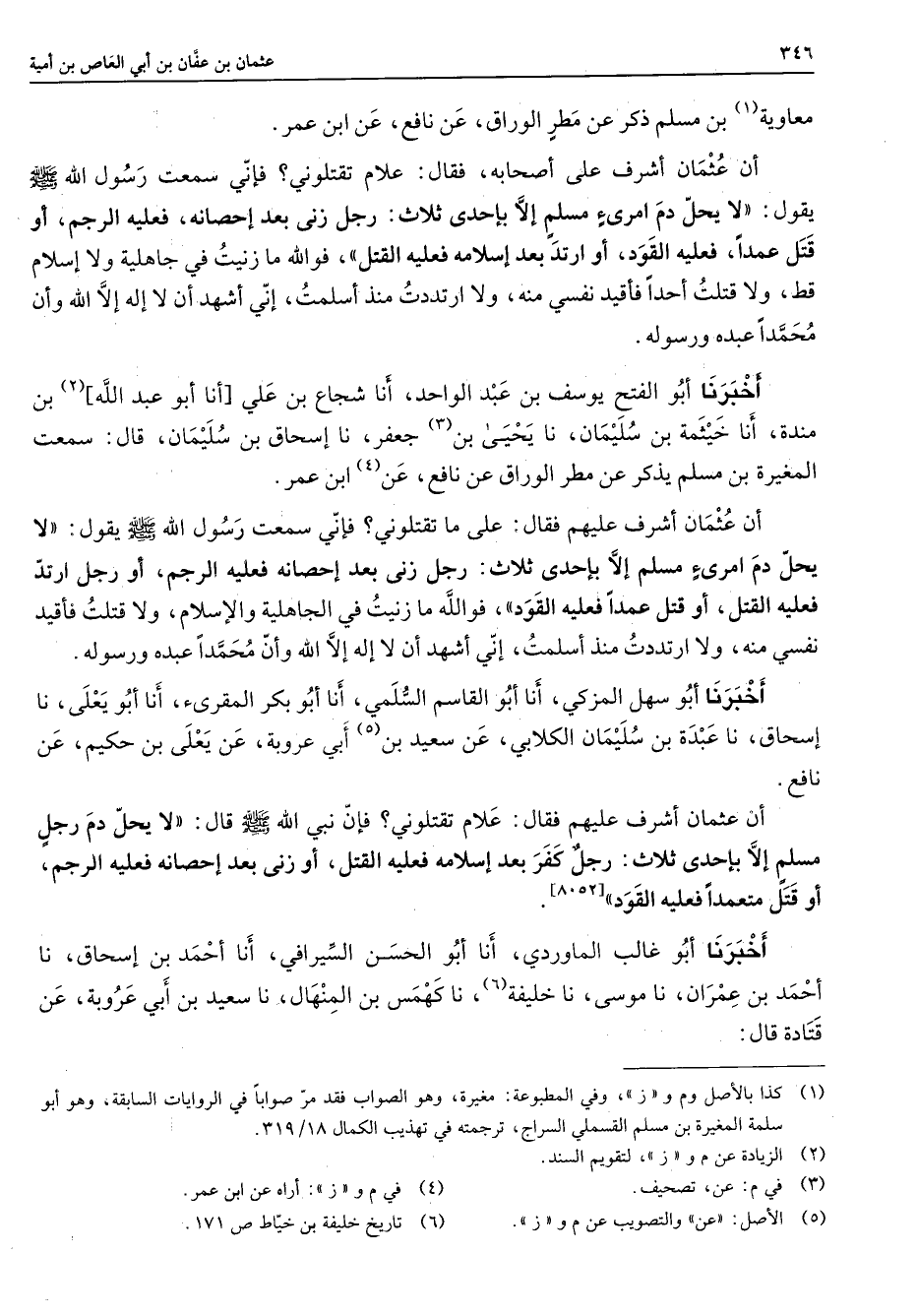 معاوية (1) بن مسلم ذكر عن مطر الوراق عن نافع عن ابن عمر أن عثمان أشرف على أصحابه فقال علام تقتلوني فإني سمعت رسول الله (صلى الله عليه وسلم) يقول لا يحل دم امرئ مسلم إلا بإحدى ثلاث رجل زنى بعد إحصانه فعليه الرجم أو قتل عمدا فعليه القود أو ارتد بعد إسلامه فعليه القتل فوالله ما زنيت في جاهلية ولا إسلام قط ولا قتلت أحدا فأقيد نفسي منه ولا ارتددت منذ أسلمت إني أشهد أن لا إله إلا الله وأن محمدا عبده ورسوله أخبرنا أبو الفتح يوسف بن عبد الواحد أنا شجاع بن علي [أنا أبو عبد الله] (2) بن مندة أنا خيثمة بن سليمان نا يحيى بن (3) جعفر نا إسحاق بن سليمان قال سمعت المغيرة بن مسلم يذكر عن مطر الوراق عن نافع عن (4) ابن عمر أن عثمان أشرف عليهم فقال على ما تقتلوني فإني سمعت رسول الله (صلى الله عليه وسلم) يقول لا يحل دم امرئ مسلم إلا بإحدى ثلاث رجل زنى بعد إحصانه فعليه الرجم أو رجل ارتد فعليه القتل أو قتل عمدا فعليه القود فوالله ما زنيت في الجاهلية والإسلام ولا قتلت فأقيد نفسي منه ولا ارتددت منذ أسلمت إني أشهد أن لا إله إلا الله وأن محمدا عبده ورسوله أخبرنا أبو سهل المزكي أنا أبو القاسم السلمي أنا أبو بكر المقرئ أنا أبو يعلى نا إسحاق نا عبدة بن سليمان الكلابي عن سعيد بن (5) أبي عروبة عن يعلى بن حكيم عن نافع أن عثمان أشرف عليهم فقال علام تقتلوني فإن نبي الله (صلى الله عليه وسلم) قال لا يحل دم رجل مسلم إلا بإحدى ثلاث رجل كفر بعد إسلامه فعليه القتل أو زنى بعد إحصانه فعليه الرجم أو قتل متعمدا فعليه القود
