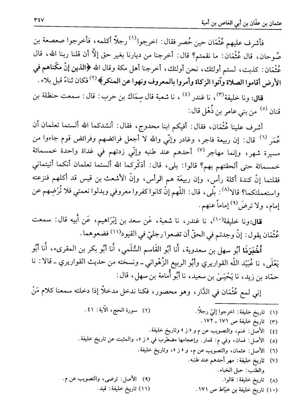 فأشرف عليهم عثمان حين حصر فقال اخرجوا (1) رجلا أكلمه فأخرجوا صعصعة بن صوحان قال عثمان ما نقمتم قال أخرجنا من ديارنا بغير حق إلا أن قلنا ربنا الله قال عثمان كذبت لستم أولئك نحن أولئك أخرجنا أهل مكة وقال الله " الذين إن مكناهم في الأرض أقاموا الصلاة وآتوا الزكاة وأمروا بالمعروف ونهوا عن المنكر " (2) فكان ثناء قبل بلاء قال ونا خليفة (3) نا غندر (4) نا شعبة قال سماك بن حرب قال سمعت حنظلة بن قنان (5) من بني عامر بن ذهل قال أشرف علينا عثمان فقال أفيكم ابنا محدوج فقال أنشدكما الله ألستما تعلمان أن عمر (6) قال إن ربيعة فاجر وغادر وإني والله لا أجعل فرائضهم وفرائض قوم جاءوا من مسيرة شهر وإنما مهاجر (7) أحدهم عند طنبه وإني زدتهم في غداة واحدة خمسمائة خمسمائة حتى ألحقتهم بهم قالوا بلى قال أذكركما الله ألستما تعلمان أنكما أتيتماني فقلتما إن كندة أكلة رأس وإن ربيعة هم الرأس وإن الأشعث بن قيس قد أكلهم فنزعته واستعملتكما قالا (8) بلى قال اللهم إن كانوا كفروا معروفي وبدلوا نعمتي فلا ترضهم عن إمام ولا ترض (9) إماما عنهم قال ونا خليفة (10) نا غندر نا شعبة عن سعد بن إبراهيم عن أبيه قال سمعت عثمان يقول إن وجدتم في الحق أن تضعوا رجلي في القيود (11) فضعوهما أخبرنا أبو سهل بن سعدوية أنا أبو القاسم السلمي أنا أبو بكر بن المقرئ أنا أبو يعلى نا عبيد الله القواريري وأبو الربيع الزهواني ونسخته من حديث القواريري قالا نا حماد بن زيد نا يحيى بن سعيد نا أبو أمامة بن سهل قال إني لمع عثمان في الدار وهو محصور فكنا ندخل مدخلا إذا دخلته سمعنا كلام من