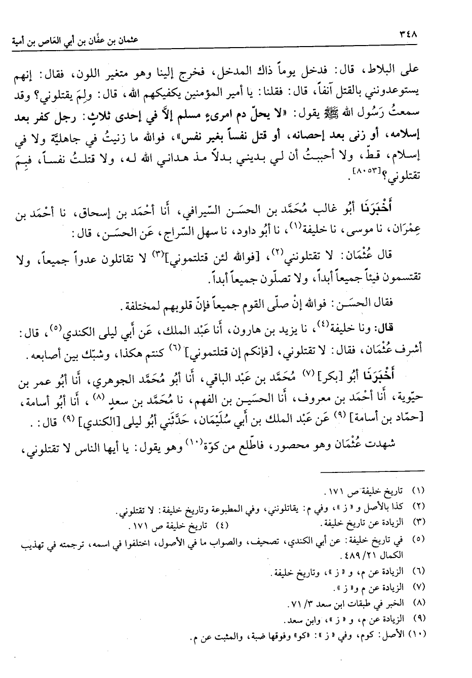 [8053] أخبرنا أبو غالب محمد بن الحسن السيرافي أنا أحمد بن إسحاق نا أحمد بن عمران نا موسى نا خليفة (1) نا أبو داود نا سهل السراج عن الحسن قال قال عثمان لا تقتلونني (2) [فوالله لئن قتلتموني] (3) لا تقاتلون عدوا جميعا ولا تقتسمون فيئا جميعا أبدا ولا تصلون جميعا أبدا فقال الحسن فوالله إن صلى القوم جميعا فإن قلوبهم لمختلفة قال ونا خليفة (4) نا يزيد بن هارون أنا عبد الملك عن أبي ليلى الكندي (5) قال أشرف عثمان فقال لا تقتلوني [فإنكم إن قتلتموني] (6) كنتم هكذا وشبك بين أصابعه أخبرنا أبو [بكر] (7) محمد بن عبد الباقي أنا أبو محمد الجوهري أنا أبو عمر بن حيوية أنا أحمد بن معروف أنا الحسين بن الفهم نا محمد بن سعد (8) أنا أبو أسامة [حماد بن أسامة] (9) عن عبد الملك بن أبي سليمان حدثني أبو ليلى [الكندي] (9) قال شهدت عثمان وهو محصور فاطلع من كوة (10) وهو يقول يا أيها الناس لا تقتلوني