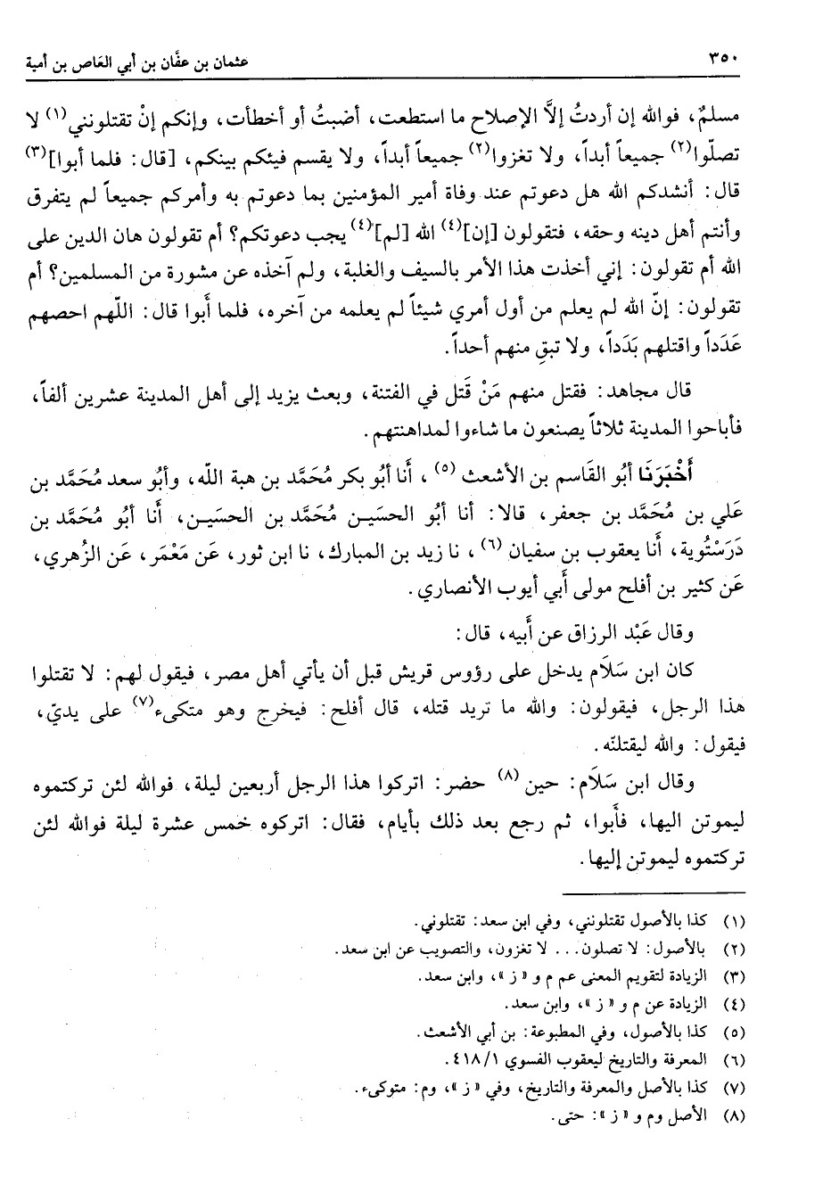 مسلم فوالله إن أردت إلا الإصلاح ما استطعت أصبت أو أخطأت وإنكم إن تقتلونني (1) لا تصلوا (2) جميعا أبدا ولا تغزوا (2) جميعا أبدا ولا يقسم فيئكم بينكم [قال فلما أبوا] (3) قال أنشدكم الله هل دعوتم عند وفاة أمير المؤمنين بما دعوتم به وأمركم جميعا لم يتفرق وأنتم أهل دينه وحقه فتقولون [إن] (4) الله [لم] (4) يجب دعوتكم أم تقولون هان الدين على الله أم تقولون إني أخذت هذا الأمر بالسيف والغلبة ولم آخذه عن مشورة من المسلمين أم تقولون إن الله لم يعلم من أول أمري شيئا لم يعلمه من آخره فلما أبوا قال اللهم احصهم عددا واقتلهم بددا ولا تبق منهم أحدا قال مجاهد فقتل منهم من قتل في الفتنة وبعث يزيد إلى أهل المدينة عشرين ألفا فأباحوا المدينة ثلاثا يصنعون ما شاءوا لمداهنتهم أخبرنا أبو القاسم بن الأشعث (5) أنا أبو بكر محمد بن هبة الله وأبو سعد محمد بن علي بن محمد بن جعفر قالا أنا أبو الحسين محمد بن الحسين أنا أبو محمد بن درستوية أنا يعقوب بن سفيان (6) نا زيد بن المبارك نا ابن ثور عن معمر عن الزهري عن كثير بن أفلح مولى أبي أيوب الأنصاري وقال عبد الرزاق عن أبيه قال كان ابن سلام يدخل على رؤوس قريش قبل أن يأتي أهل مصر فيقول لهم لا تقتلوا هذا الرجل فيقولون والله ما تريد قتله قال أفلح فيخرج وهو متكئ (7) على يدي فيقول والله ليقتلنه وقال ابن سلام حين (8) حضر اتركوا هذا الرجل أربعين ليلة فوالله لئن تركتموه ليموتن إليها فأبوا ثم رجع بعد ذلك بأيام فقال اتركوه خمس عشرة ليلة فوالله لئن تركتموه ليموتن إليها
