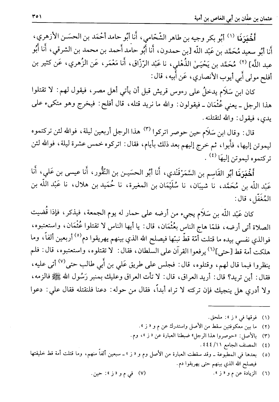 أخبرنا (1) أبو بكر وجيه بن طاهر الشحامي أنا أبو حامد أحمد بن الحسن الأزهري أنا أبو سعيد محمد بن عبد الله [بن حمدون أنا أبو حامد أحمد بن محمد بن الشرقي أنا أبو عبد الله] (2) محمد بن يحيى الذهلي نا عبد الرزاق أنا معمر عن الزهري عن كثير بن أفلح مولى أبي أيوب الأنصاري عن أبيه قال كان ابن سلام يدخل على رءوس قريش قبل أن يأتي أهل مصر فيقول لهم لا تقتلوا هذا الرجل يعني عثمان فيقولون والله ما نريد قتله قال أفلح فيخرج وهو متكئ على يدي فيقول والله لتقتلنه قال وقال ابن سلام حين حوصر اتركوا (3) هذا الرجل أربعين ليلة فوالله لئن تركتموه ليموتن إليها فأبوا ثم خرج إليهم بعد ذلك بأيام فقال اتركوه خمس عشرة ليلة فوالله لئن تركتموه ليموتن إليها (4) أخبرنا أبو القاسم بن السمرقندي أنا أبو الحسين بن النقور أنا عيسى بن علي أنا عبد الله بن محمد نا شيبان نا سليمان بن المغيرة نا حميد بن هلال نا عبد الله بن المغفل قال كان عبد الله بن سلام يجئ من أرضه على حمار له يوم الجمعة فيذكر فإذا قضيت الصلاة أتى أرضه فلما هاج الناس بعثمان قال يا أيها الناس لا تقتلوا عثمان واستعتبوه فوالذي نفسي بيده ما قتلت أمة قط نبيها فيصلح الله الذي بينهم يهريقوا دم أربعين ألفا وما هلكت أمة قط [حتى] (6) يرفعوا القرآن على السلطان فقال لا تقتلوه واستعتبوه قال فلم ينظروا فيما قال لهم وقتلوه قال فجلس على طريق علي بن أبي طالب حتى (7) أتى عليه فقال أين تريد قال أريد العراق قال لا تأت العراق وعليك بمنبر رسول الله (صلى الله عليه وسلم) فالزمه ولا أدري هل ينجيك فإن تركته لا تراه أبدا فقال من حوله دعنا فلنقتله فقال علي دعوا