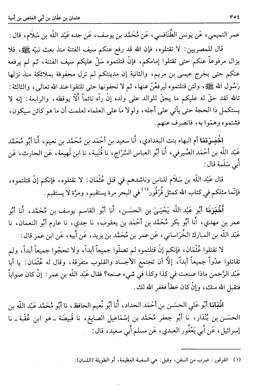 عمر التميمي عن يونس الطنافسي عن محمد بن يوسف عن جده عبد الله بن سلام قال قال للمصريين لا تقتلوه فإن الله قد رفع عنكم سيف الفتنة منذ بعث نبيه (صلى الله عليه وسلم) فلا يزال مرفوعا عنكم حتى تقتلوا إمامكم فإن قتلتموه سل عليكم سيف الفتنة ثم لم يرفعه عنكم حتى يخرج عيسى بن مريم والثانية إن مدينتكم لم تزل محفوفة بملائكة منذ نزلها رسول الله (صلى الله عليه وسلم) ولئن قتلتموه ليرفعن عنها ثم لا تحفونها حتى تلتقوا عند الله تعالى والثالثة تالله لقد حق له عليكم ما يحق للوالد على ولده إن رآه نائما ألا يوقظه والرابعة إنه لا يستكمل ذا الحجة حتى يأتي على أجله ولولا ما على العلماء لعلمت أن ما هو كائن سيكون فشتموه وهموا به فانصرف عنهم أخبرتنا أم البهاء بنت البغدادي أنا سعيد بن أحمد بن محمد بن نعيم أنا أبو محمد عبد الله بن أحمد الصيرفي أنا أبو العباس السراج نا قتيبة نا ابن لهيعة عن الحارث عن أبي سلمة قال قال عبد الله بن سلام للناس وناشدهم في قتل عثمان لا تقتلوه فإنكم إن قتلتموه فإنما مثلكم في كتاب الله كمثل قرقور (1) في البحر مرة يستقيم ومرة لا يستقيم أخبرنا أبو عبد الله يحيى بن الحسن أنا أبو القاسم يوسف بن محمد أنا أبو عمر بن مهدي أنا أبو بكر محمد بن أحمد بن يعقوب نا جدي نا عارم أبو النعمان نا عبد الله بن المبارك الخراساني عن عمر بن محمد بن يزيد عن أبيه عن ابن عمر قال لا تقتلوا عثمان فإنكم إن قتلتموه لم تصلوا جميعا أبدا ولا تحجوا جميعا أبدا ولم تقاتلوا عدوا جميعا أبدا إلا أن تجتمع الأجساد والقلوب متفرقة وقال له عثمان يا أبا عبد الرحمن ماذا صنعت في كذا وكذا في شئ صنعته فقال عبد الله بن عمر إن كان صوابا فتقبل الله منك وإن كان خطأ فغفر الله لك أنبأنا أبو علي الحسن بن أحمد الحداد أنا أبو نعيم الحافظ نا أبو محمد عبد الله بن الحسن بن بندار نا أبو جعفر محمد بن إسماعيل الصايغ نا قبيصة هو ابن عقبة نا إسرائيل عن أبي يعفور العبدي عن مسلم أبي سعيد قال