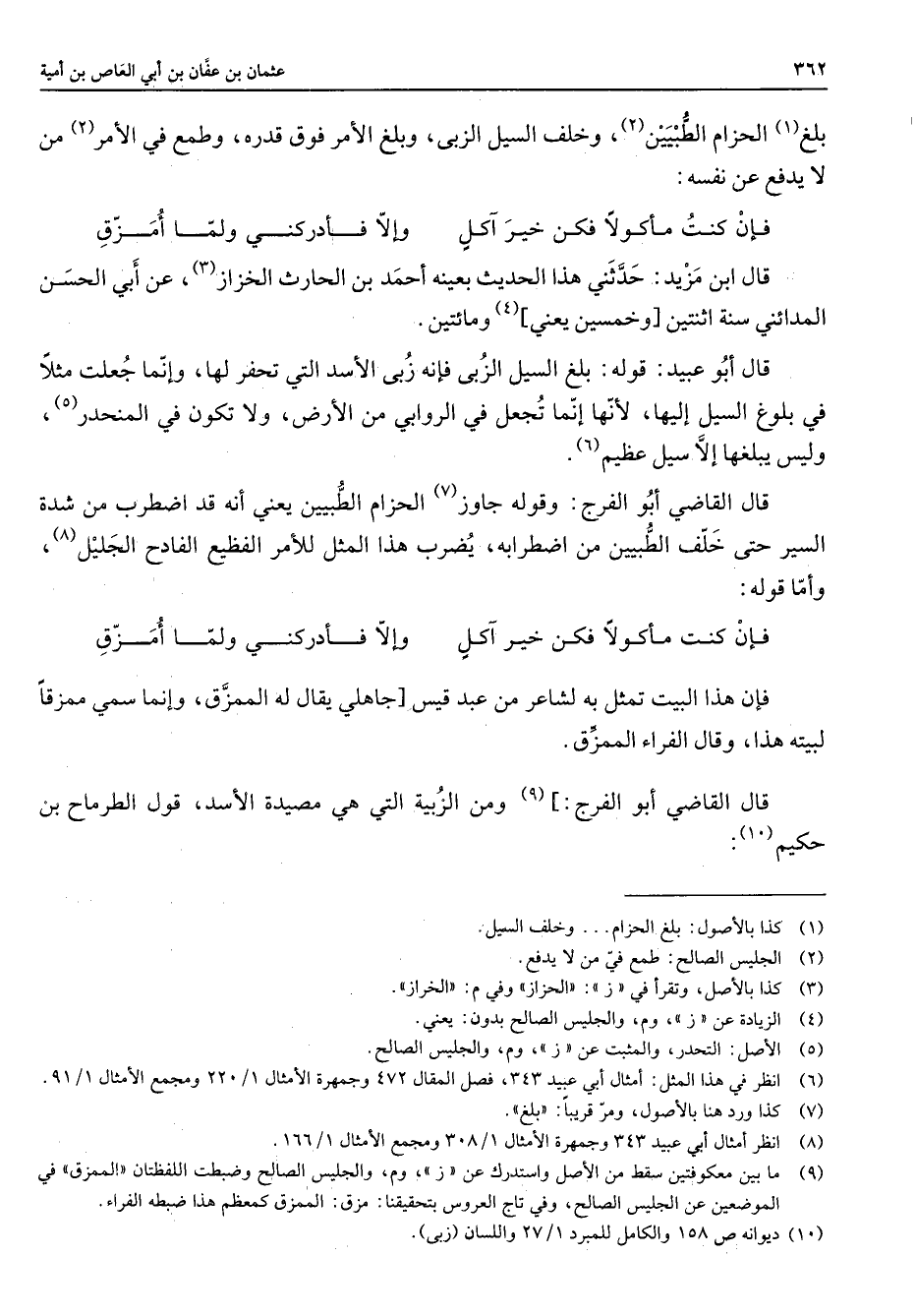 بلغ (1) الحزام الطبيين (2) وخلف السيل الزبى وبلغ الأمر فوق قدره وطمع في الأمر (3) من لا يدفع عن نفسه فإن كنت مأكولا فكن خير آكل * وإلا فأدركني ولما أمزق * قال ابن مزيد حدثني هذا الحديث بعينه أحمد بن الحارث الخزاز (3) عن أبي الحسن المدائني سنة اثنتين [وخمسين يعني] (4) ومائتين قال أبو عبيد قوله بلغ السيل الزبى فإنه زبى الأسد التي تحفر لها وإنما جعلت مثلا في بلوغ السيل إليها لأنها إنما تجعل في الروابي من الأرض ولا تكون في المنحدر وليس يبلغها إلا سيل عظيم (6) قال القاضي أبو الفرج وقوله جاوز (7) الحزام الطبيين يعني أنه قد اضطرب من شدة السير حتى خلف الطبيين من اضطرابه يضرب هذا المثل للأمر الفظيع الفادح الجليل (8) وأما قوله فإن كنت مأكولا فكن خير آكل * وإلا فأدركني ولما أمزق فإن هذا البيت تمثل به لشاعر من عبد قيس [جاهلي يقال له الممزق وإنما سمي ممزقا لبيته هذا وقال الفراء الممزق قال القاضي أبو الفرج] (9) ومن الزبية التي هي مصيدة الأسد قول الطرماح بن حكيم (10)