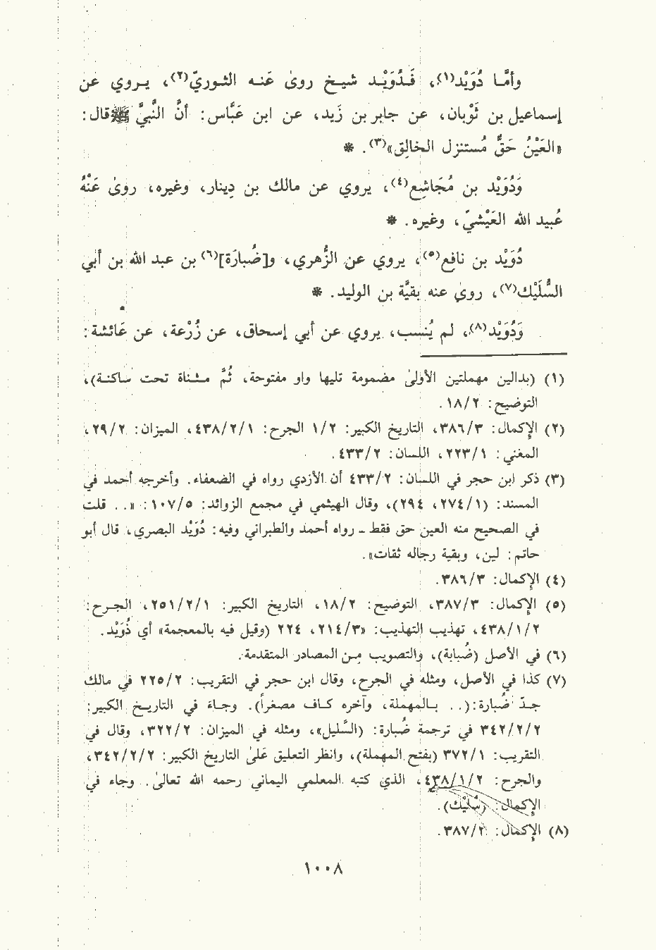 وأمَّا دُوَيْد , فدُوَيْد شَيْخ رَوَى عنه الثَّوْريّ , يَرْوي عن إِسْمَاعِيل بن ثوبان , عن جابر بن زيد، عن ابن عَبَّاس: أنَّ النَّبِيَّ صلى الله عليه وسلم قال: العين حق مستنزل الخالق.