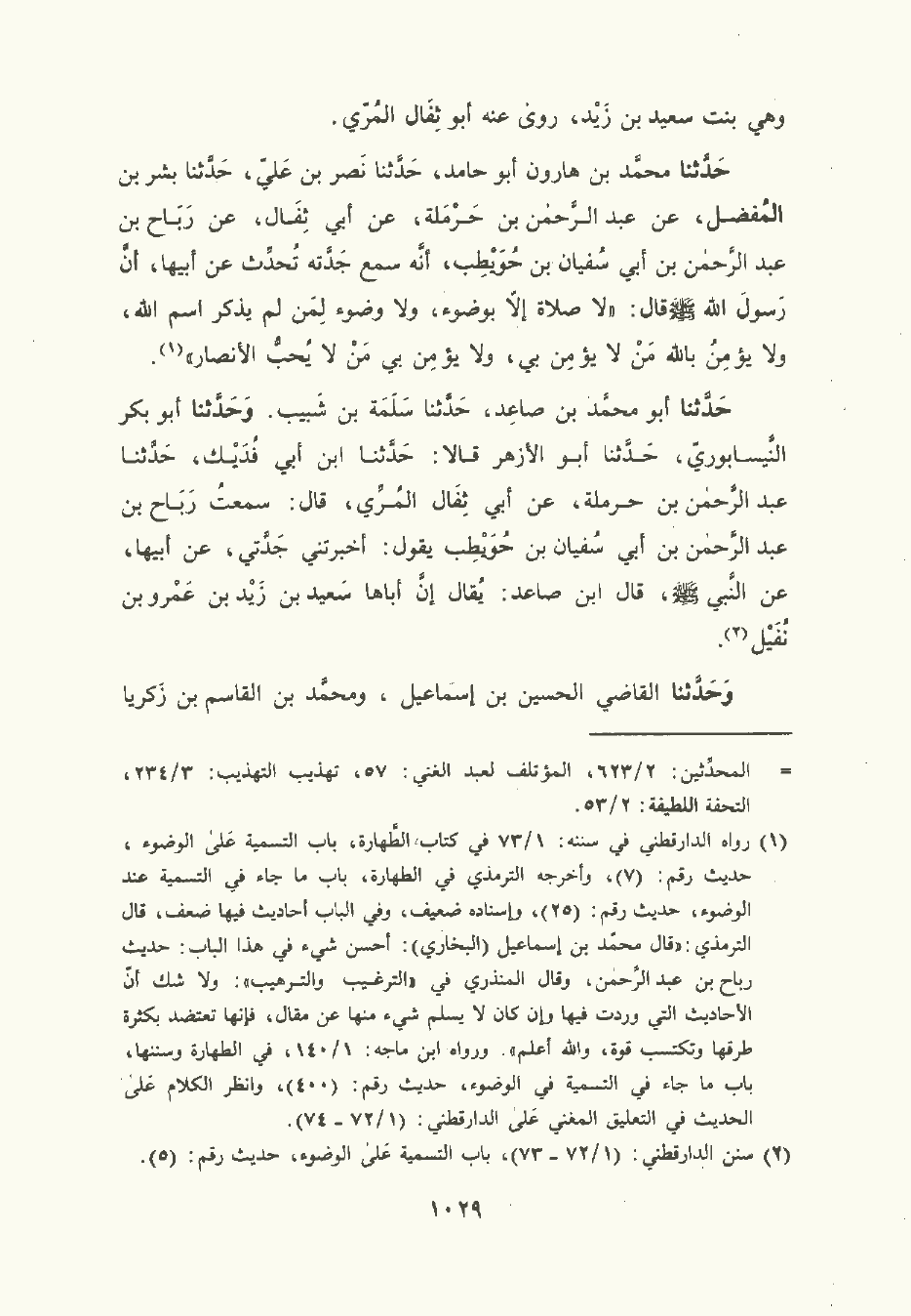 حَدَّثَنا مُحمَّد بن هارون أبو حامد , حَدَّثَنا نصر بن علي , حَدَّثَنا بشر بن المفضل، عن عَبد الرَّحْمن بن حرملة، عن أبي ثفال , عن رَبَاح بن عبد الرَّحْمن بن أبي سُفْيان بن حويطب أنه سمع جدته تُحَدِّث عن أبيها أن رسول الله صلى الله عليه وسلم قال: لا صلاة إلا بوضوء ولا وضوء لمن لم يذكر اسم الله ولا يؤمن بالله من لا يؤمن بي ولا يؤمن بي من لا يحب الأَنْصَار.