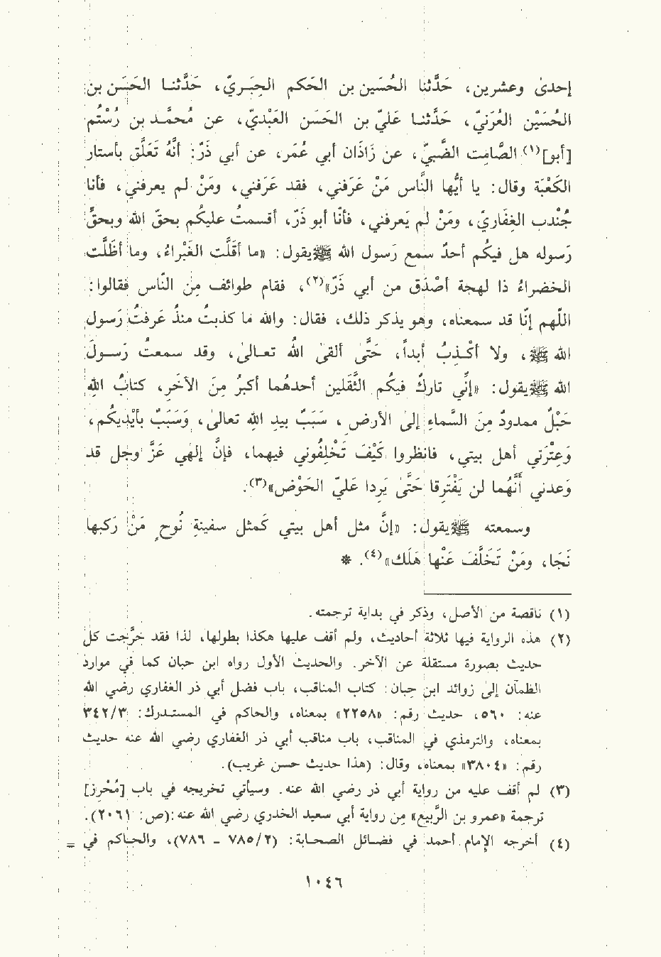 عن مُحمَّد بن رُسْتُم أبو الصامت الضبي , عن زاذان أبي عُمَر، عن أبي ذر: أنه تعلق بأستار الكعبة وقال: يا أيها النَّاس من عرفني فقد عرفني ومن لم يعرفني فأنا جندب الغِفَاريّ ومن لم يعرفني فأنا أبو ذر أقسمت عليكم بحق الله وبحق رسوله هل فيكم أحد سمع رسول الله صلى الله عليه وسلم يقول: ما أقلت الغبراء وما أظلت الخضراء ذا لهجة أصدق من أبي ذر فقام طوائف من النَّاس فقالوا: اللهم إنا قد سمعناه , وهو يذكر ذلك فقال: والله ما كذبت منذ عرفت رسول الله صلى الله عليه وسلم ولا أكذب أبدا حتى ألقى الله تعالى وقد سمعت رسول الله صلى الله عليه وسلم يقول: إني تراك فيكم الثقلين أحدهما أكبر من الآخر كتاب الله حبل ممدود من السماء إلى الأرض سبب بيد الله تعالى وسبب بأيديكم وعترتي أهل بيتي فانظروا كيف تخلفوني فيهما فإن إلهي عز وجل قد وعدني أنهما لن يفترقا حتى يردا علي الحوض.