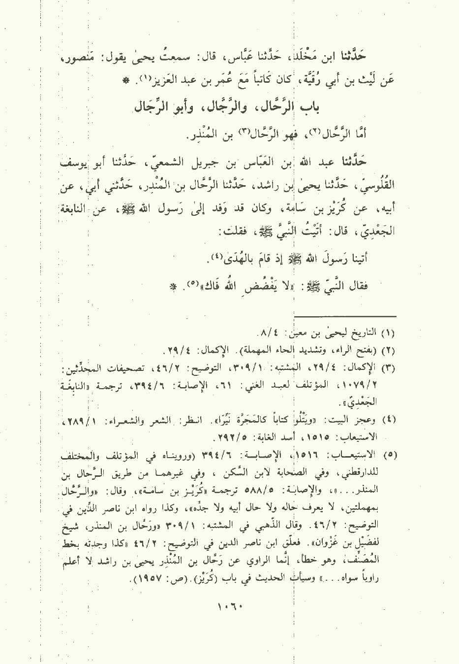 حَدَّثَنا عَبد الله بن العَبَّاس بن جِبْرِيل الشمعي , حَدَّثَنا أبو يُوسُف القلوسي , حَدَّثَنا يَحْيى بن راشد , حَدَّثَنا الرحال بن المُنْذر , حَدَّثني أبي , عن أبيه , عن كريز بن سامة , وكان قد وفد إلى رسول الله صلى الله عليه وسلم , عن النابغة الجعدي , قال: أتيت النَّبِيّ صلى الله عليه وسلم فقلت: