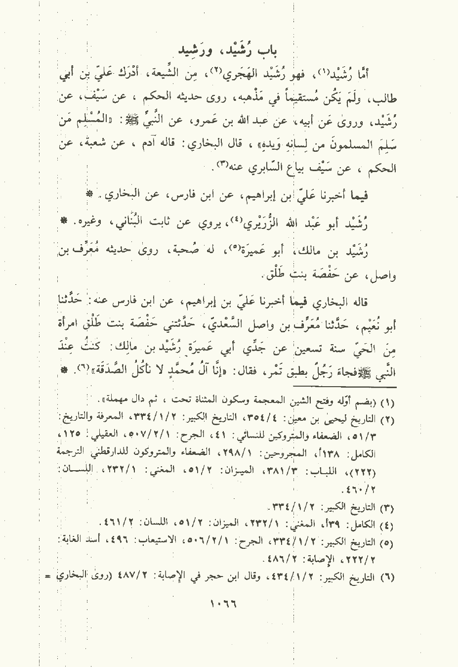 أمّا رُشَيْد , فهو رُشَيْد الهجري من الشيعة , أدرك عَلِيّ بن أبي طَالِب , ولم يكن مستقيما في مذهبه , روى حديثه الحكم , عن سَيْف , عن رُشَيْد , وروى عن أبيه، عن عَبد الله بن عَمْرو , عن النَّبِيِّ صلى الله عليه وسلم: المسلم من سلم المسلمون من لسانه ويده، قال البُخَاريُّ: قاله آدم , عن شُعْبة , عن الحكم , عن سَيْف بياع السابري عنه.