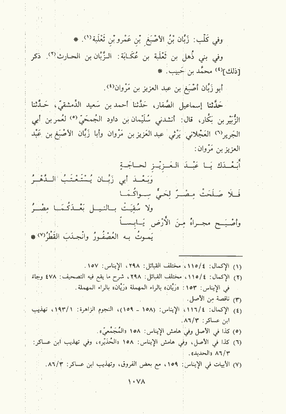 حَدَّثَنا إِسْمَاعِيل الصَّفار , حَدَّثَنا أحمد بن سَعِيد الدِّمَشْقيّ , حَدَّثَنا الزُّبَيْر بن بَكَّار قال: أنشدني سُلَيْمان بن داود الجمحي لعمر بن أبي الجرير العجلاني يرثي عبد العزيز بن مَرْوان وأبا زَبَّان الأصبغ بن عبد العزيز بن مَرْوان: