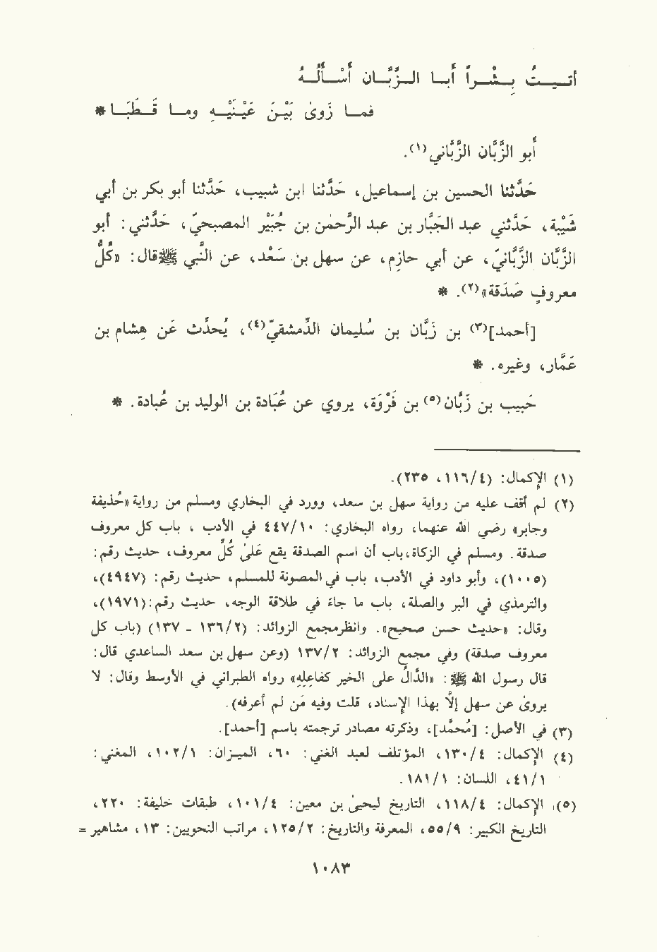 حَدَّثَنا الحُسَين بن إِسْمَاعِيل , حَدَّثَنا ابن شبيب , حَدَّثَنا أبو بكر بن أبي شَيْبَة , حَدَّثني عبد الجبار بن عبد الرَّحْمن بن جبير المصبحي , حَدَّثني: أبو الزبان الزباني، عن أبي حَازِم , عن سَهْل بن سَعْد , عن النَّبِيِّ صلى الله عليه وسلم قال: كل معروف صدقة.
