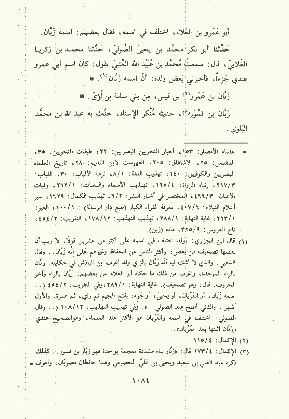 حَدَّثَنا أبو بكر مُحمَّد بن يَحْيى الصُّولي , حَدَّثَنا مُحمَّد بن زكريا الغلابي قال: سَمِعتُ مُحمَّد بن عبيد الله العُتبي يقول: كان اسم أبي عَمْرو عندي جزءا فأخبرني بعض ولده: أن اسمه زبان.