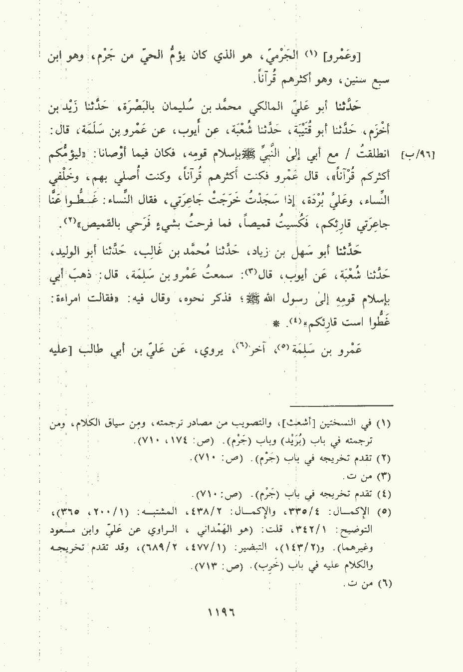 وعَمْرو الجَرْمِي , هو الذي كان يؤم الحي من جرم , وهو ابن سبع سنين , وهو أكثرهم قرآنا.