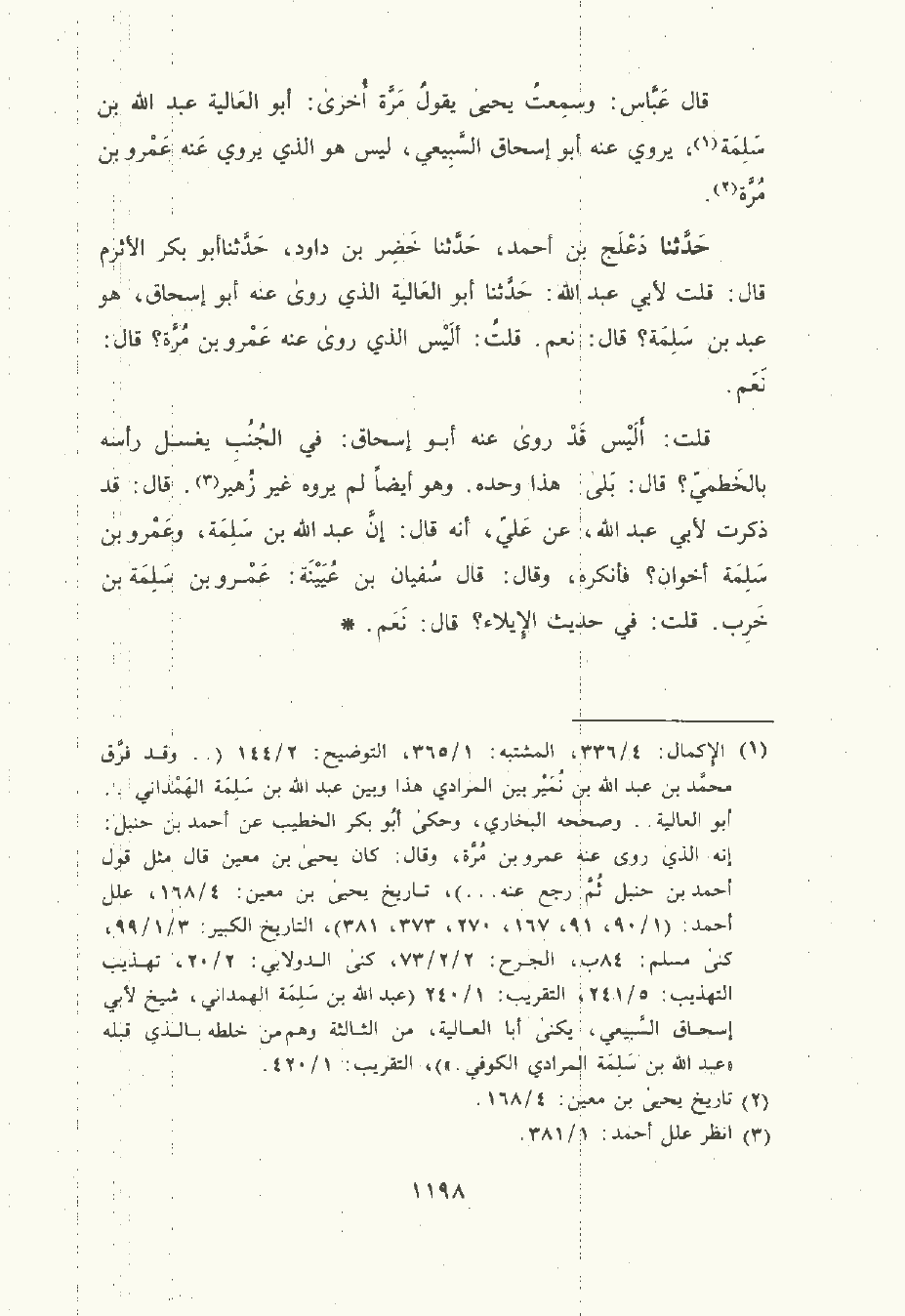 حَدَّثَنا دَعْلَج بن أحمد , حَدَّثَنا خضر بن داود , حَدَّثَنا أبو بَكْر الأَثْرَم قال: قلت لأبي عَبد الله: حَدَّثَنا أبو العالية الذي رَوَى عَنْه أبو إِسْحَاق هو عبد بن سَلِمَة؟ قال: نعم. قلت: أليس الذي رَوَى عَنْه عَمْرو بن مُرَّة؟ قال: نعم.