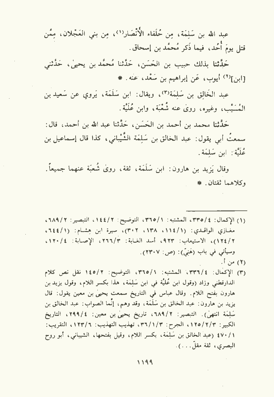 حَدَّثَنا مُحَمد بن أحمد بن الحَسَن , حَدَّثَنا عَبد الله بن أحمد قال: سَمِعتُ أبي يقول: عبد الخالق بن سَلِمَة الشَّيْبانِيّ , كذا قال إِسْمَاعِيل بن عُلَيَّة: ابن سلمة.