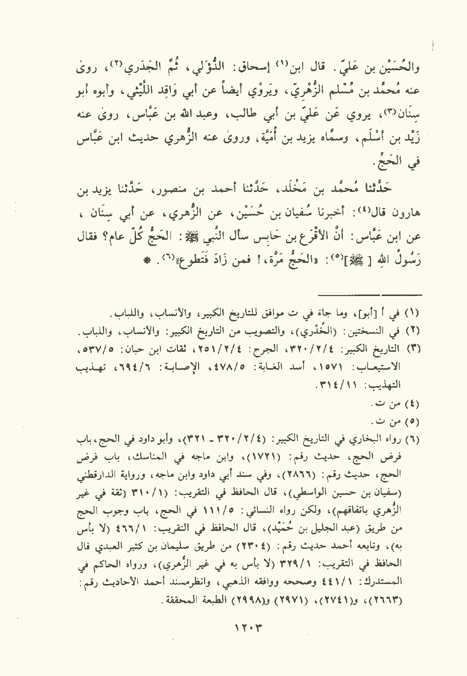حَدَّثَنا مُحَمد بن مَخْلد , حَدَّثَنا أحمد بن مَنْصُور , حَدَّثَنا يزيد بن هارون قال: أخبرنا سُفْيان بن حسين , عن الزُّهْريّ , عن أبي سِنَان , عن ابن عَبَّاس: أنّ الأقرع بن حابس سأل النَّبِيّ صلى الله عليه وسلم: الحج كل عام؟ فقال رسول الله صلى الله عليه وسلم: "الحج مرة فمن زاد فتطوع".