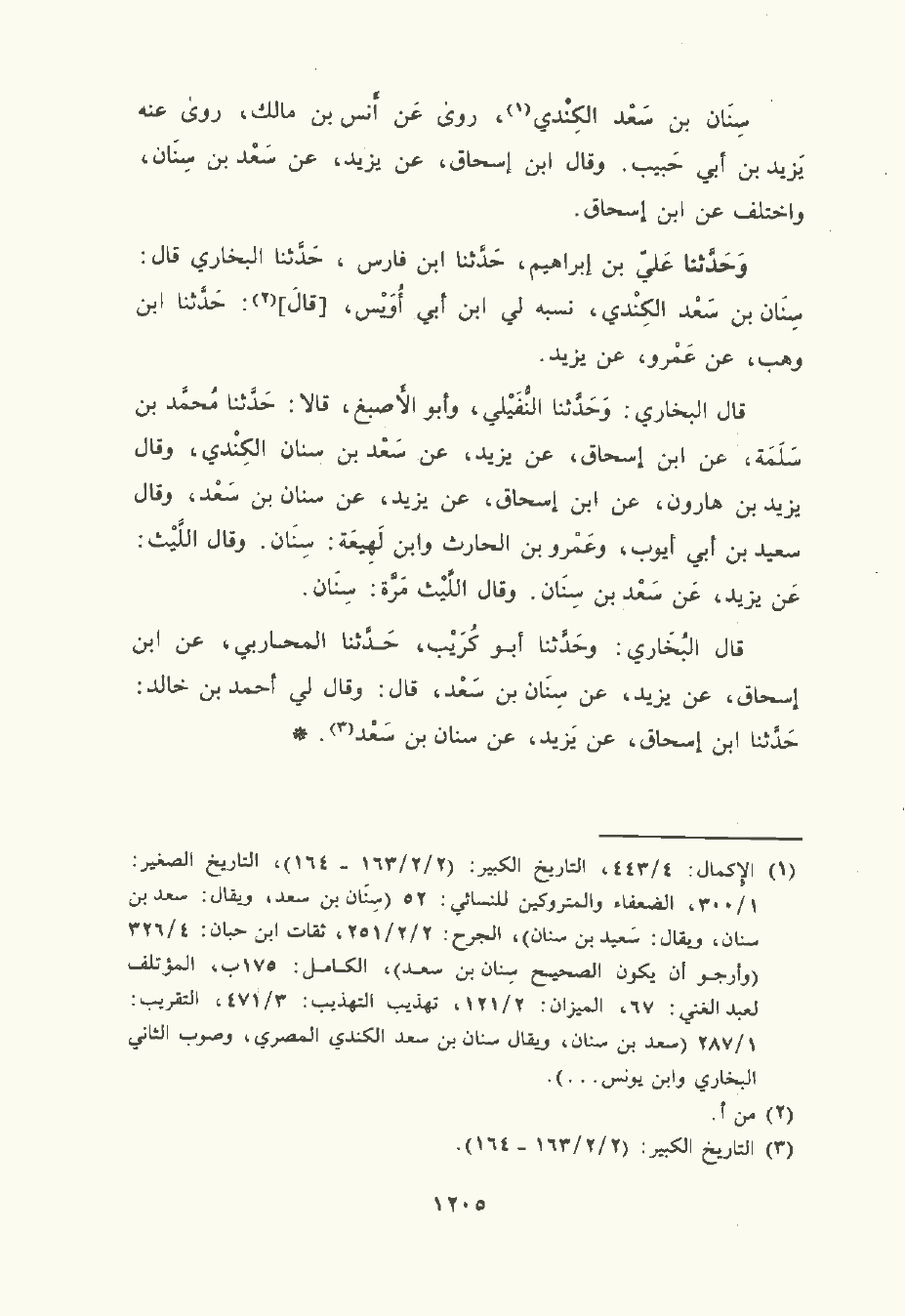 قال البُخَاريُّ: وحَدَّثَنا النُفَيْلِي , وأبو الأَصْبغ , قَالا: حَدَّثَنا مُحَمد بن سَلَمَة , عن ابن إِسْحَاق , عن يزيد , عن سَعْد بن سِنَان الكِنْدي , وقال يزيد بن هارون , عن ابن إِسْحَاق , عن يزيد , عن سِنَان بن سَعْد , وقال سَعِيد بن أبي أَيُّوب , وعَمْرو بن الحارث , وابن لَهِيعَة: سِنَان. وقال اللَّيْث: عن يزيد , عن سَعْد بن سِنَان. وقال اللَّيْث مرة: سنان.