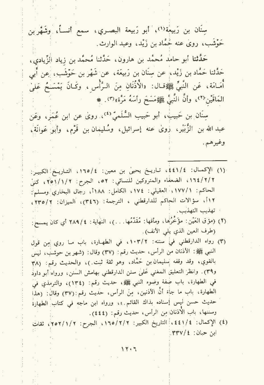 حَدَّثَنا أبو حامد مُحَمد بن هارون , حَدَّثَنا مُحَمد بن زياد الزيادي , حَدَّثَنا حمَّاد بن زيد , عن سِنَان بن ربيعة , عن شهر بن حوشب , عن أبي أُمَامَة , عن النَّبِيِّ صلى الله عليه وسلم قال: "الأذنان من الرأس , وكان يمسح على الماقين , وأنّ النَّبِيّ صلى الله عليه وسلم مسح رأسه مرة".