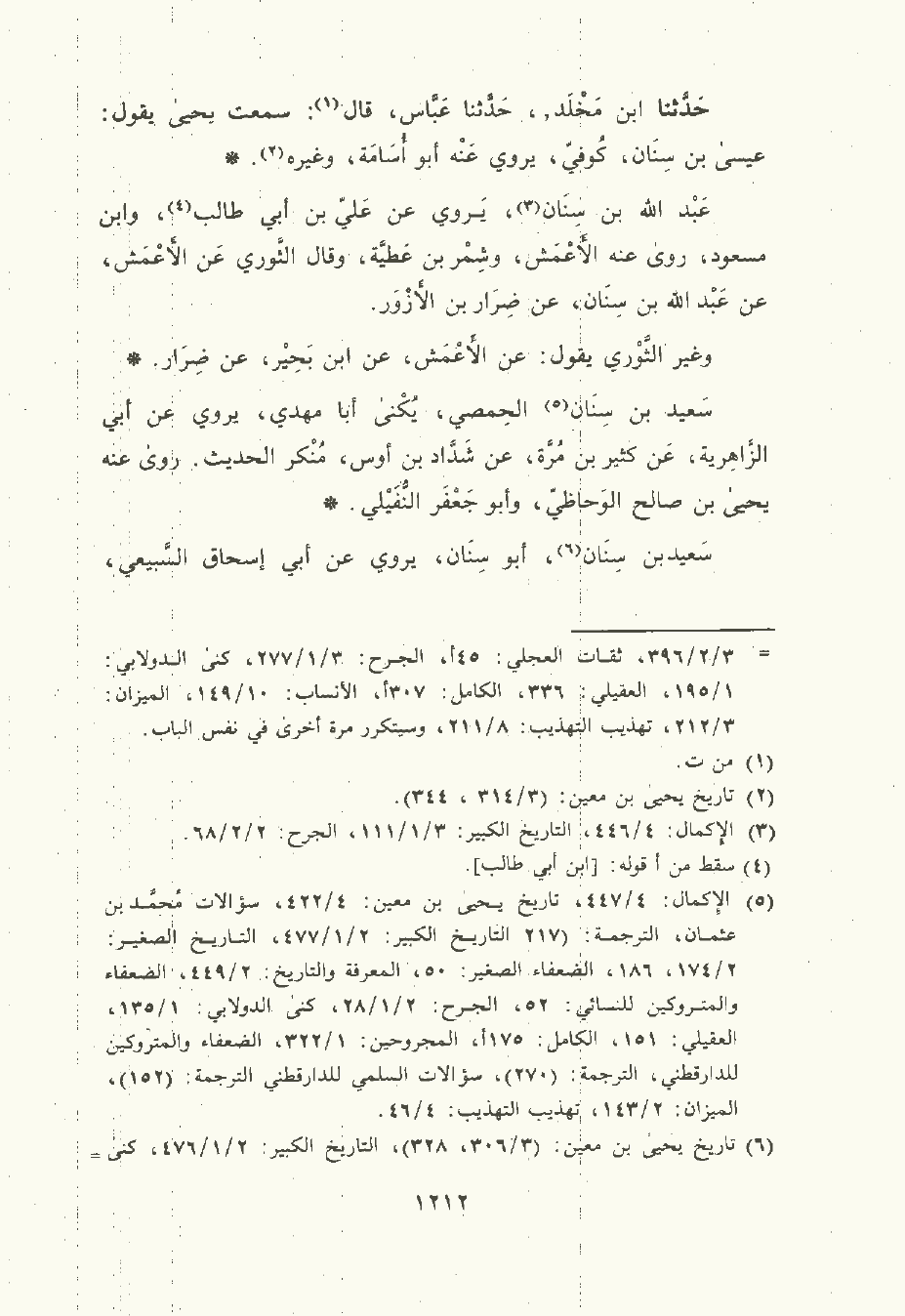 حَدَّثَنا ابن مَخْلَد , حَدَّثَنا عَبَّاس قال: سَمِعتُ يَحْيى يقول: عِيسَى بن سِنَان , كُوفِيّ يَرْوي عنه أبو أُسَامَة , وغيره.
