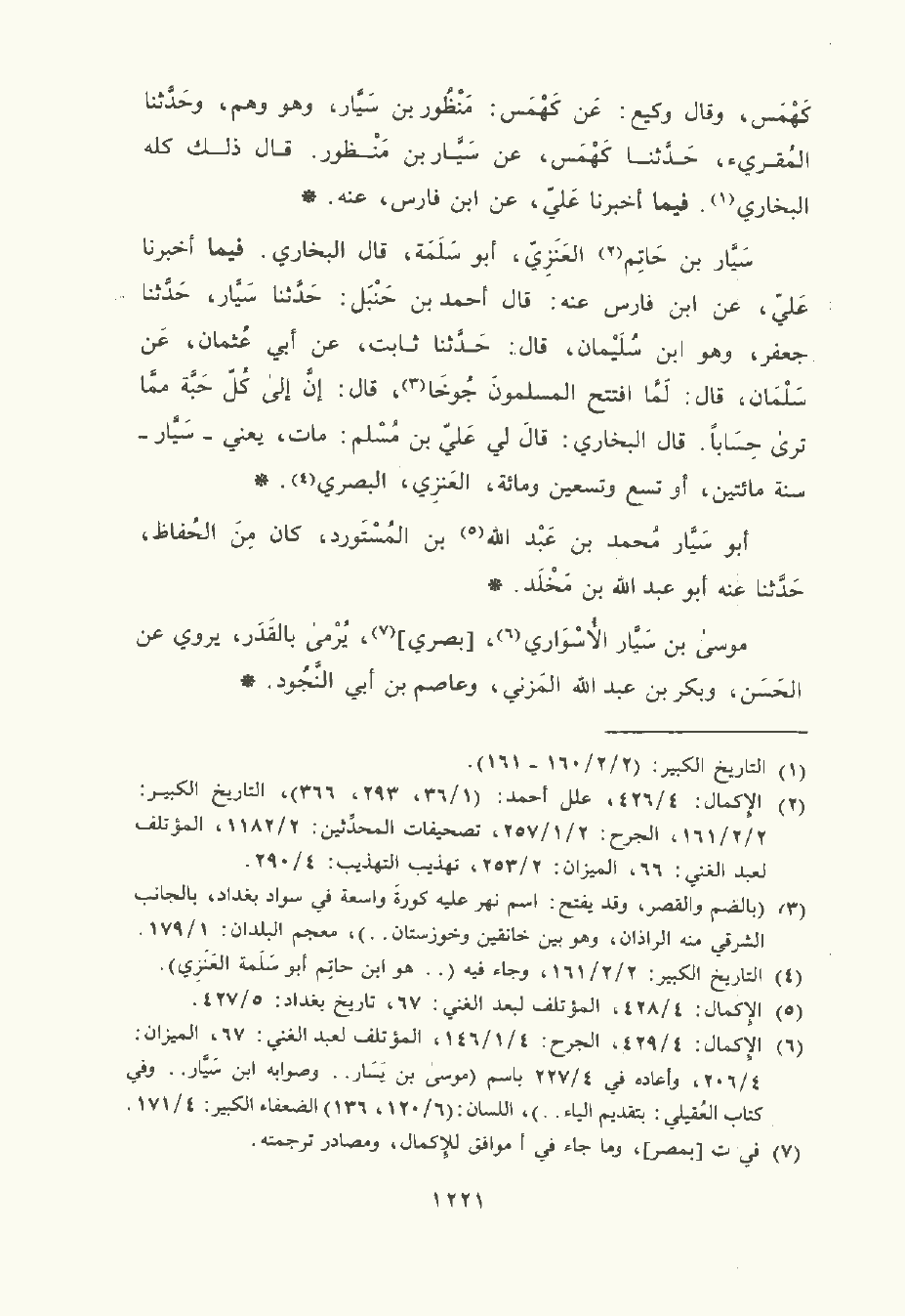 سَيَّار بن حاتم العنزي أبو سلمة , قال البُخَاريُّ. فيما أَخْبَرنا عَلِيٌّ , عن ابن فَارِس عَنْه: قال أحمد بن حَنْبل: حَدَّثَنا سَيَّار , حَدَّثَنا جَعْفر , وهو ابن سُلَيْمان قال: حَدَّثَنا ثابت , عن أبي عُثْمان , عن سَلْمَان قال: لما افتتح المسلمون جوخا , قال: إن إلى كل حبة مما ترى حسابا. قال البُخَاريُّ: قال لي علي بن مسلم: مات , يعني سيار , سنة مائتين أو تسع وتسعين ومِئَة العنزي البَصْريّ.