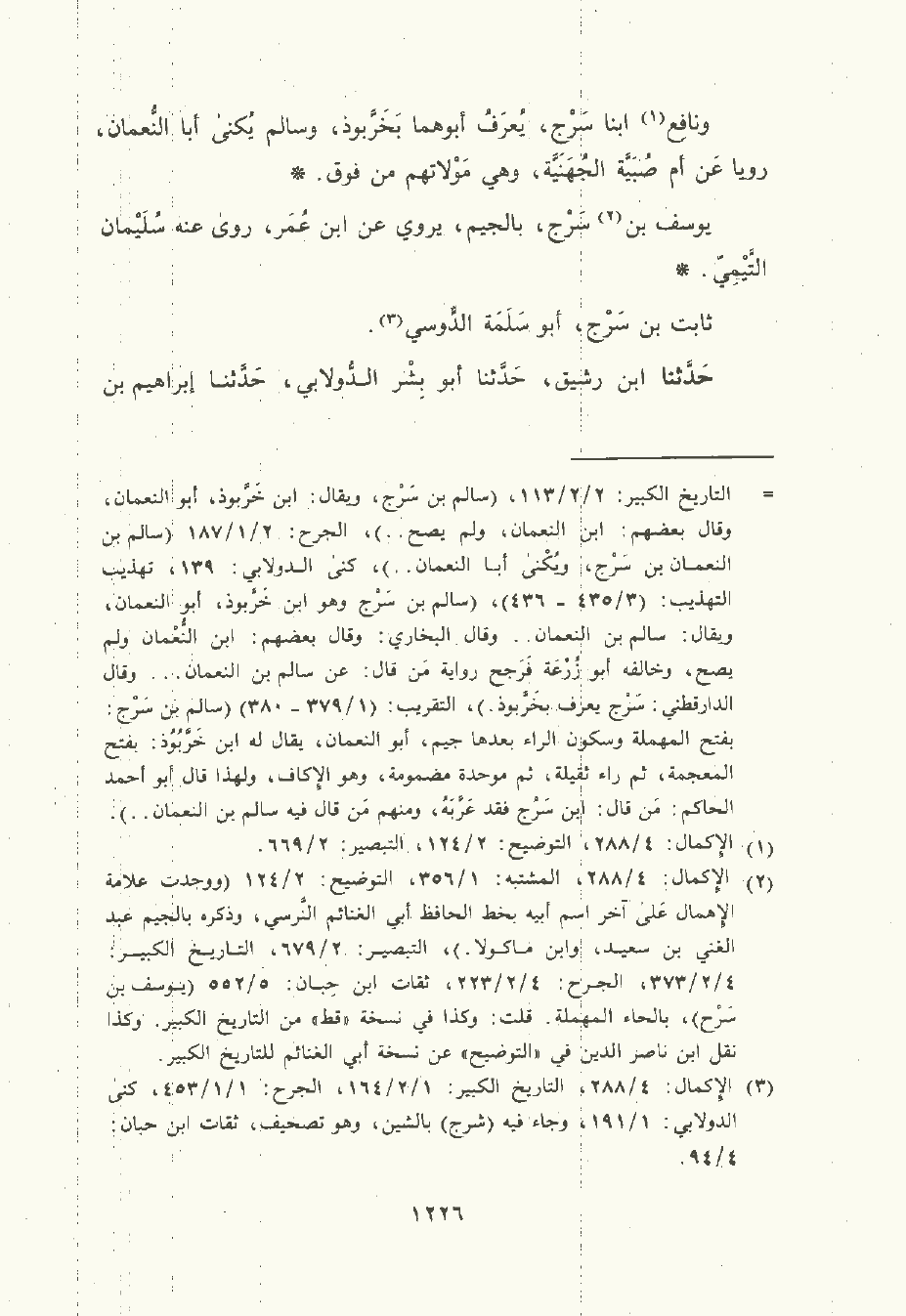 ونَافِع ابنا سَرْج , يعرف أبوهما بخربوذ , وسالم يُكْنَى أبا النُّعْمان , رويا عن أم صبية الجهنية وهي مولاتهم من فوق.