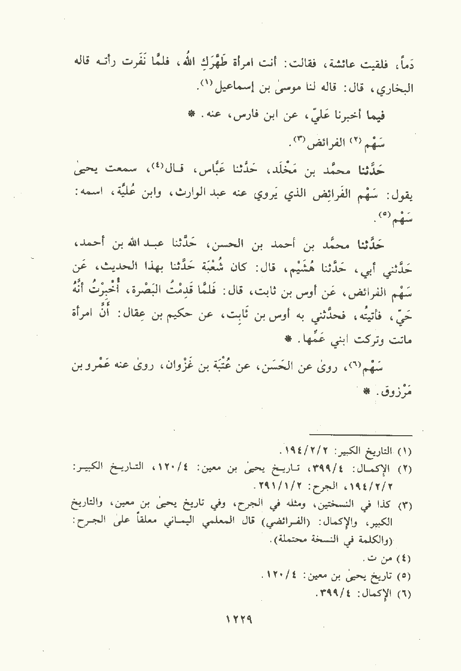 حَدَّثَنا مُحَمد بن مَخْلد , حَدَّثَنا عَبَّاس قال سمعت يَحْيى يقول: سهم الفرائض الذي يَرْوي عنه عَبْد الوَارِث , وابن علية اسمه: سهم.